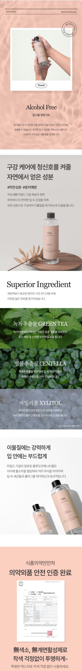 Mixsoon Life Mild Gargle Peach Fragrance is crafted with gentle ingredients, focusing on the health of your delicate oral cavity. We’ve selected natural ingredients that are kind to your mouth yet effective in oral care.