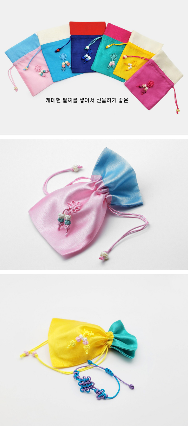 Each bracelet is beautifully packaged in a lucky bag (bokjumeoni) — a traditional Korean charm symbolizing good fortune and prosperity.