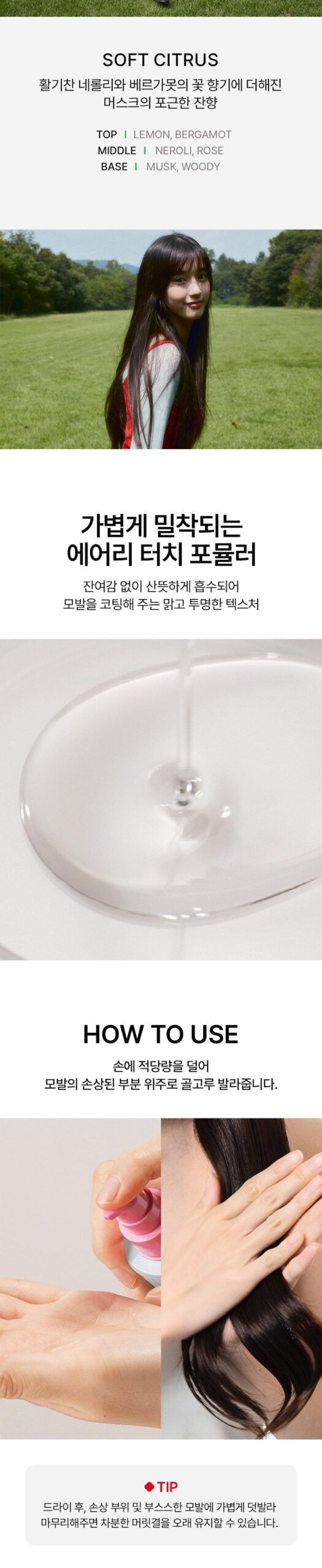 The airy-touch essence absorbs instantly without residue, leaving your hair soft and smooth with a healthy sheen.