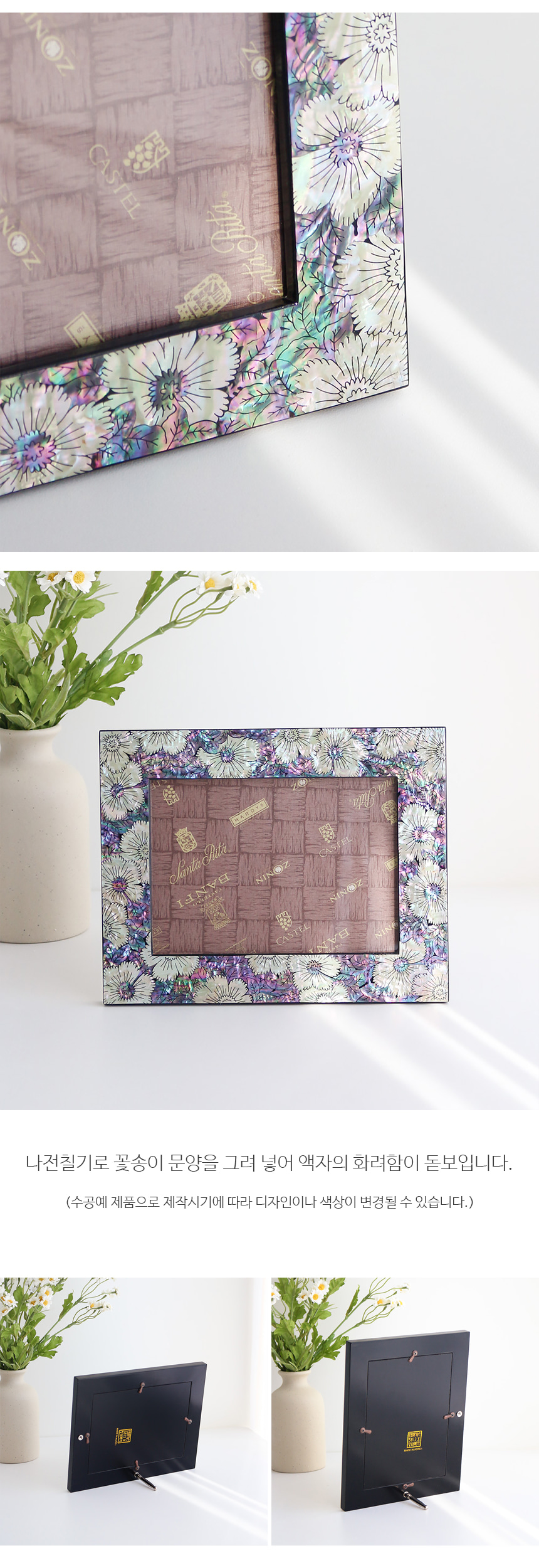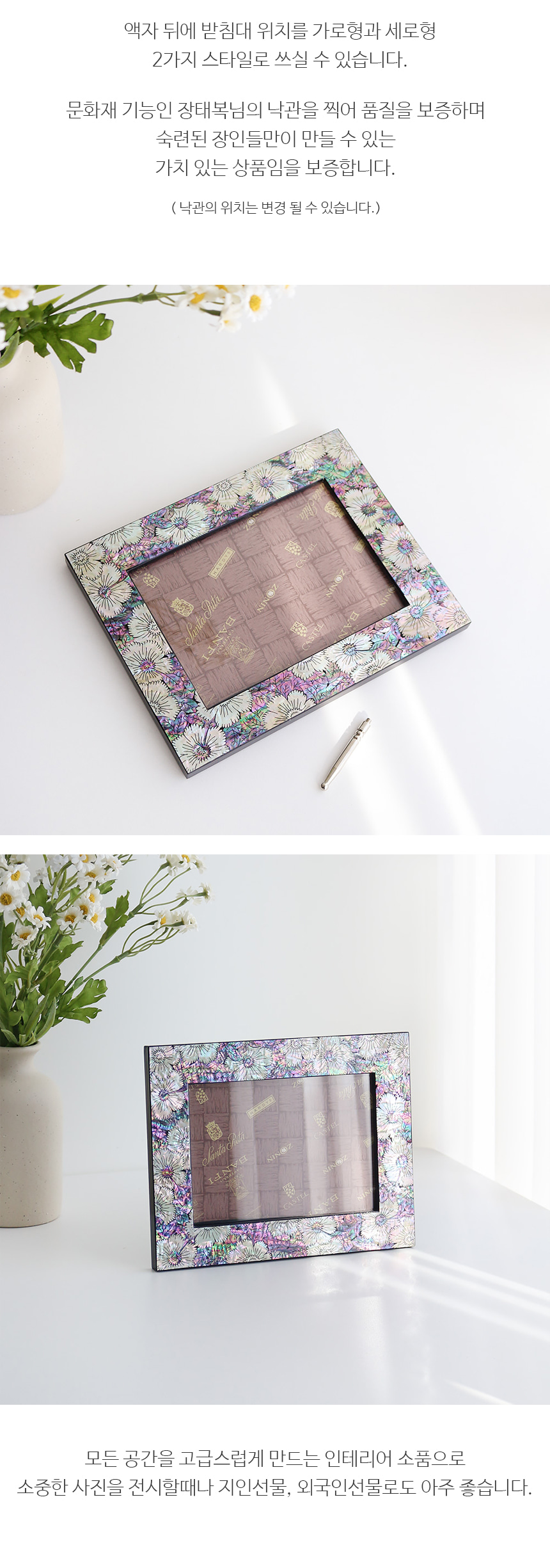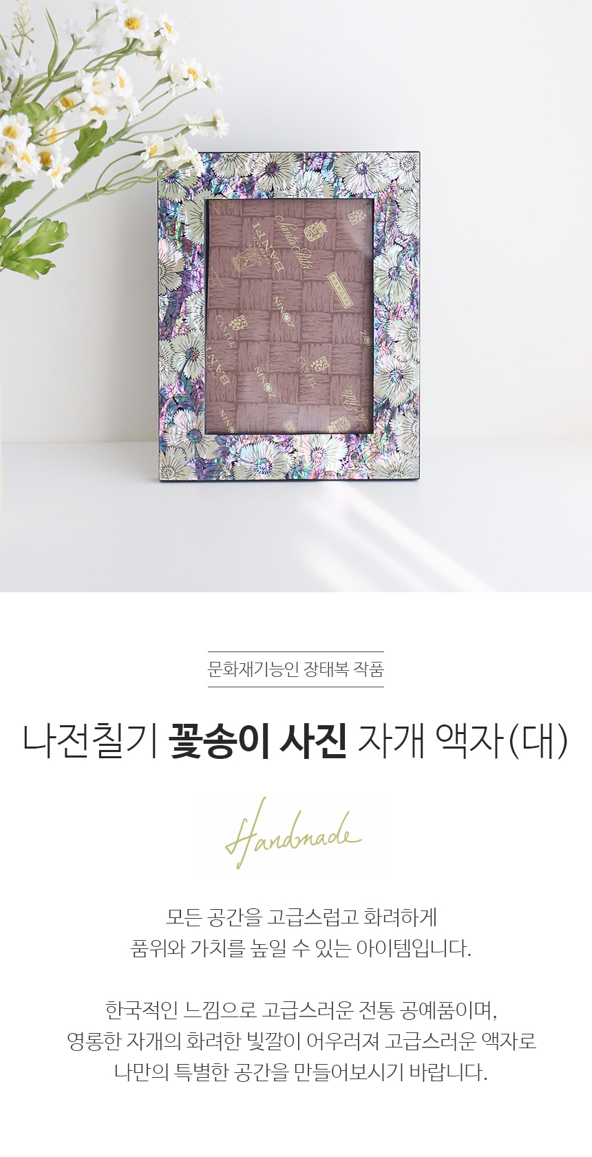 Discover the exquisite Mother-of-Pearl Lacquer Flower Photo Frame, an artistic creation by renowned cultural heritage craftsman Jang Tae-bok. This stunning piece is designed to enhance any space with its elegance and sophistication, making it a perfect addition to your home or office.