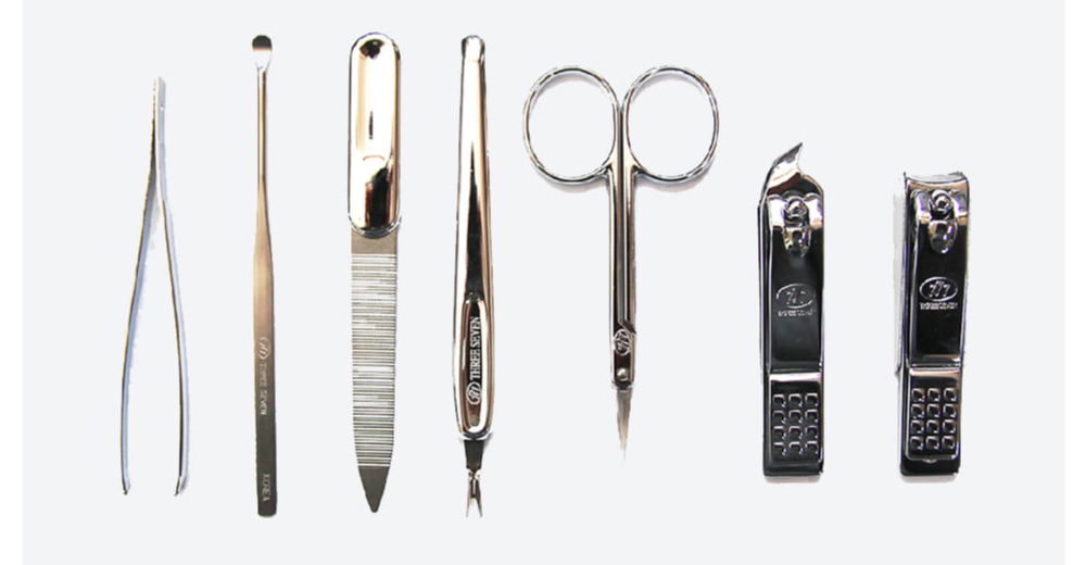 Inside the case, the set includes: tweezers, ear pick, file (nail polishing tool), V-shaped pusher, cuticle scissors, cuticle nail clipper, and nail clipper. All items are securely fixed to prevent movement.