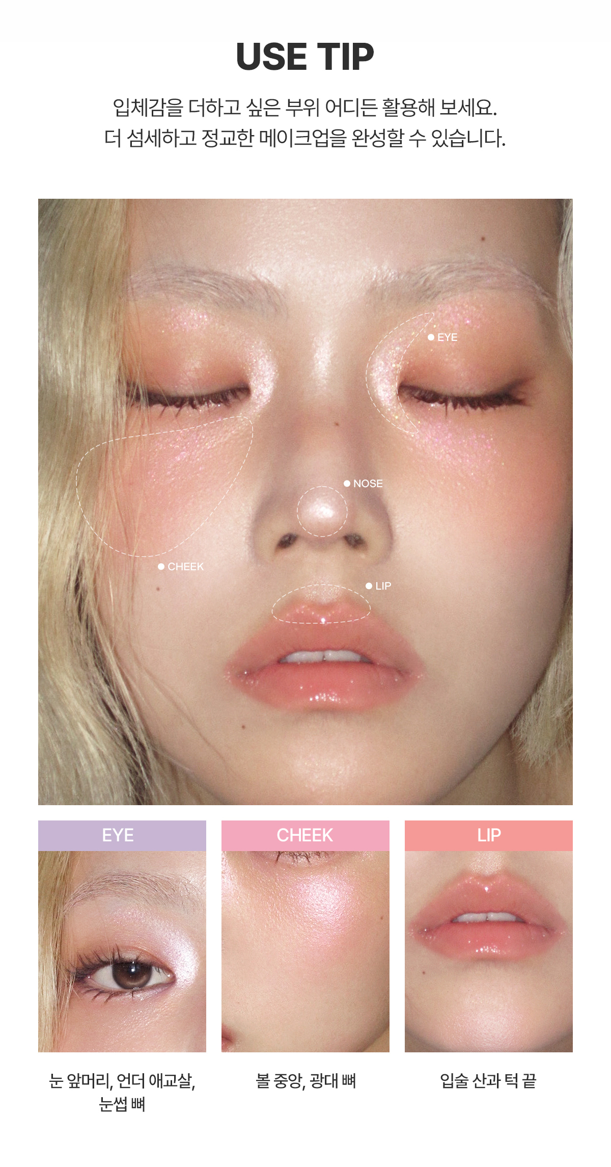 Recommended for illuminating key areas such as your cheekbones, the tip of your nose, and your cupid’s bow to achieve a captivating, soft, and radiant glow.