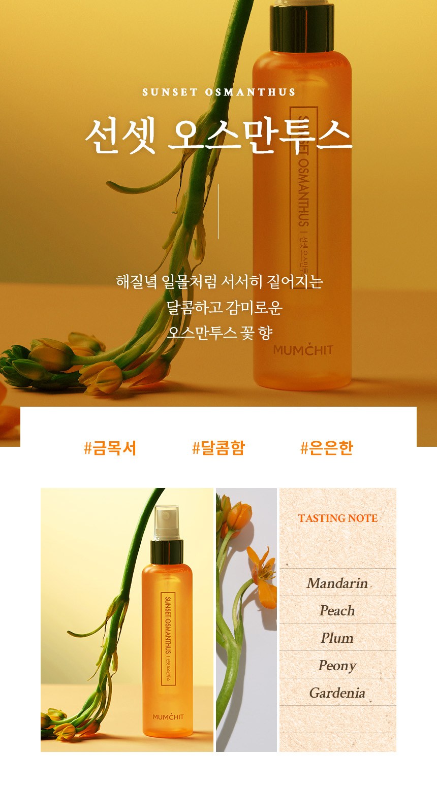 Sweet and luscious osmanthus flower scent that gradually deepens like a sunset.