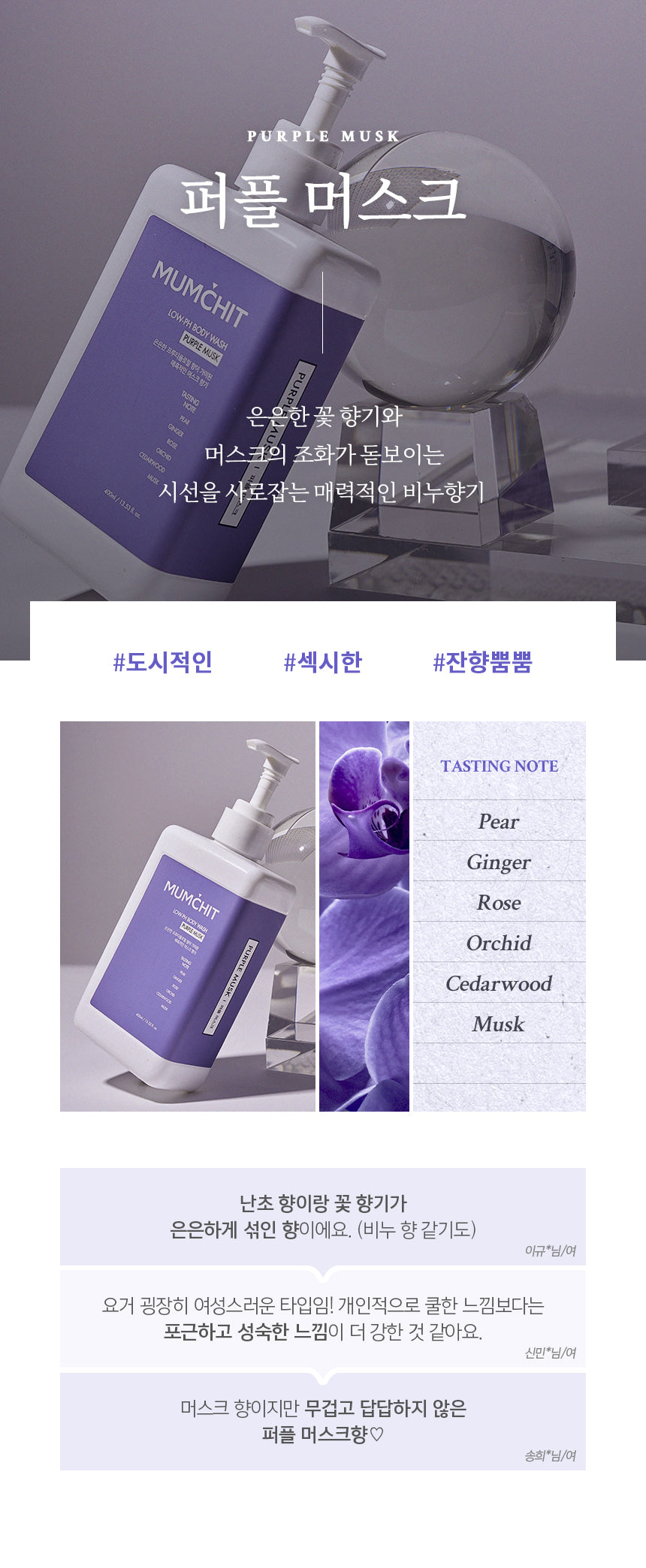 Discovering MUMCHIT’s body wash was a delight! Its purple musk offers a sophisticated aroma while maintaining essential skin balance with its mildly acidic formula. Love how clean and hydrated I feel post-shower!
