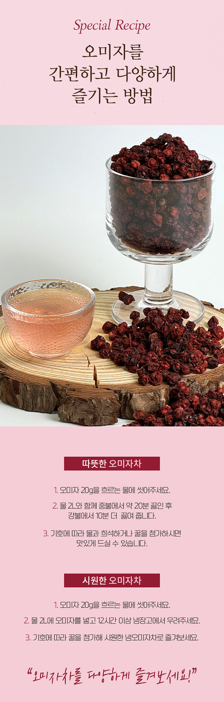 Enjoy Omija in every season: refreshing as a chilled tea in summer, or soothing as a warm tea in winter. It also adds a distinctive taste and color to various dishes.