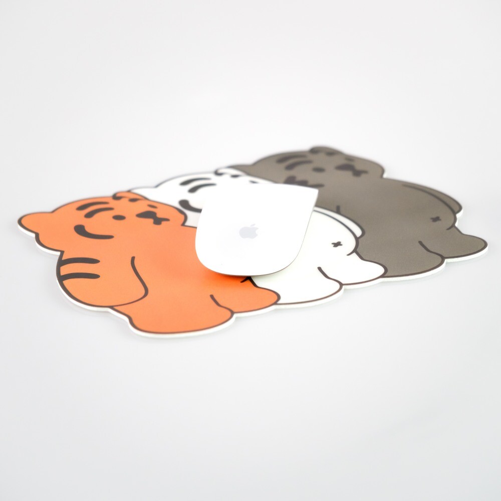 Brighten up your workspace with this adorable MUZIK TIGER mouse pad featuring three standing tigers. With an orange tiger, white tiger, and brown tiger standing together in perfect attention, this uniquely shaped mouse pad brings Korean character charm to your desk.