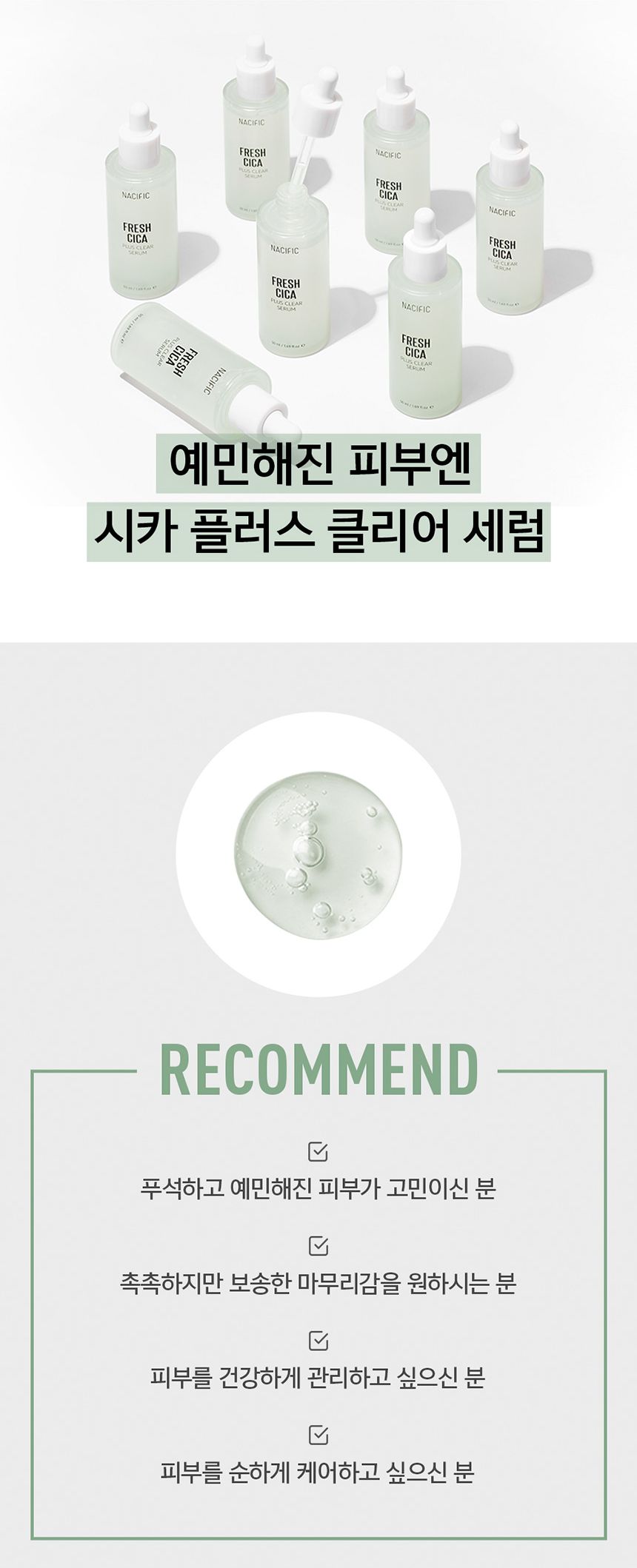 Nacific Fresh Cica Plus Clear Serum is a refreshing serum that is designed to soothe, hydrate and control excess sebum in acne-prone skin. It features a green cica complex made up of three types of centella asiatica to calm weak and sensitive skin, while ceramide and panthenol strengthen the skin barrier and prevent skin troubles.