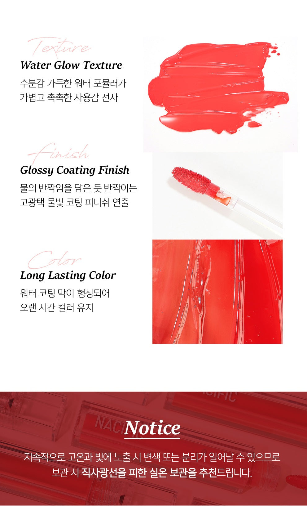 The water glow texture provides a light and moist feeling, while the glossy coating finish creates a high-gloss, water-colored coating that sparkles as if it contains the sparkle of water. The water coating film is formed to maintain color for a long time.