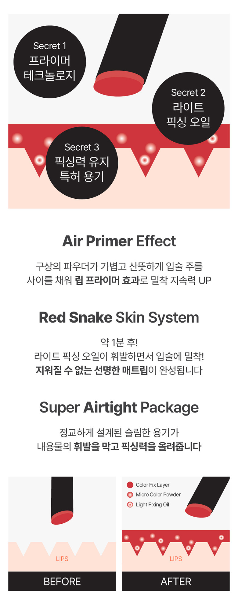 Through the Red Snake Skin System, the light fixing oil evaporates after about one minute, leaving a lightweight, vivid matte film that perfectly adheres to your lips — completely smudge-proof and non-transferable.