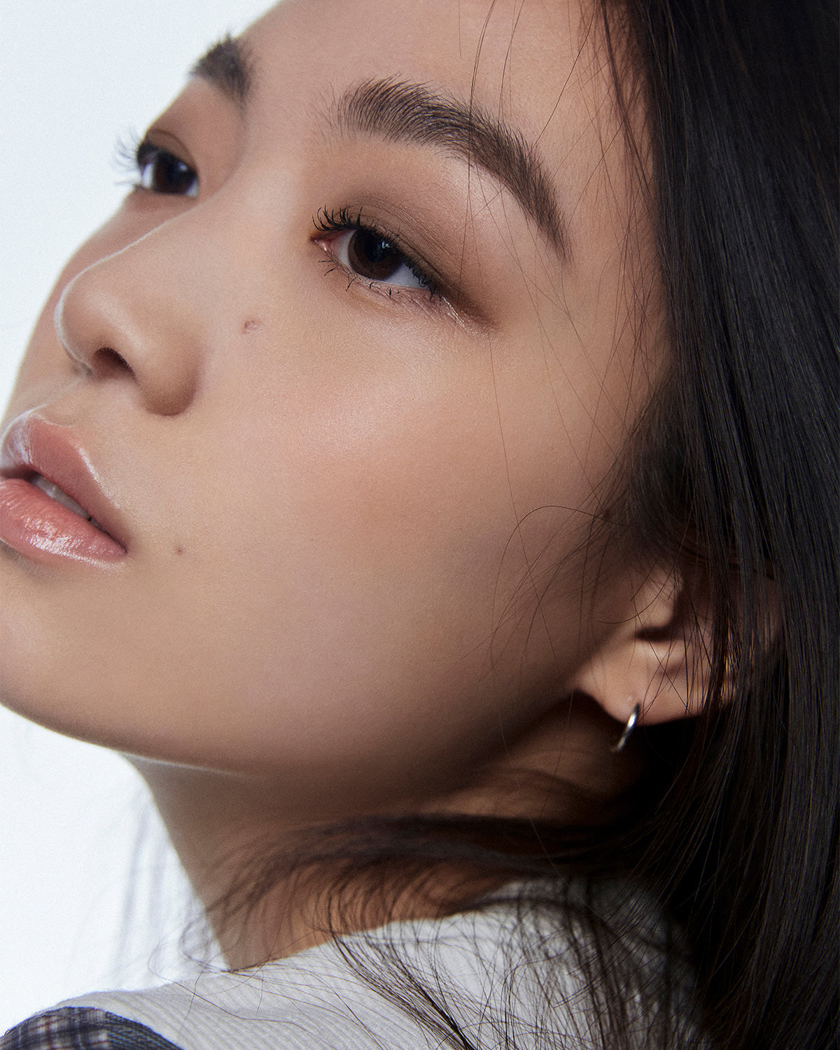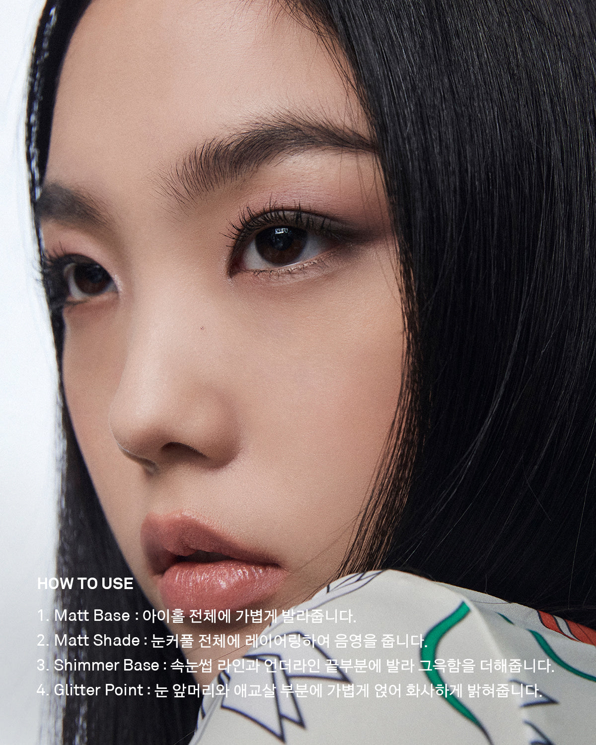 3) Apply the point color with your fingertip or glitter brush #120 by lightly pressing it on the area where you want to add sparkle, such as the outer corner of the eye or the eyelid.