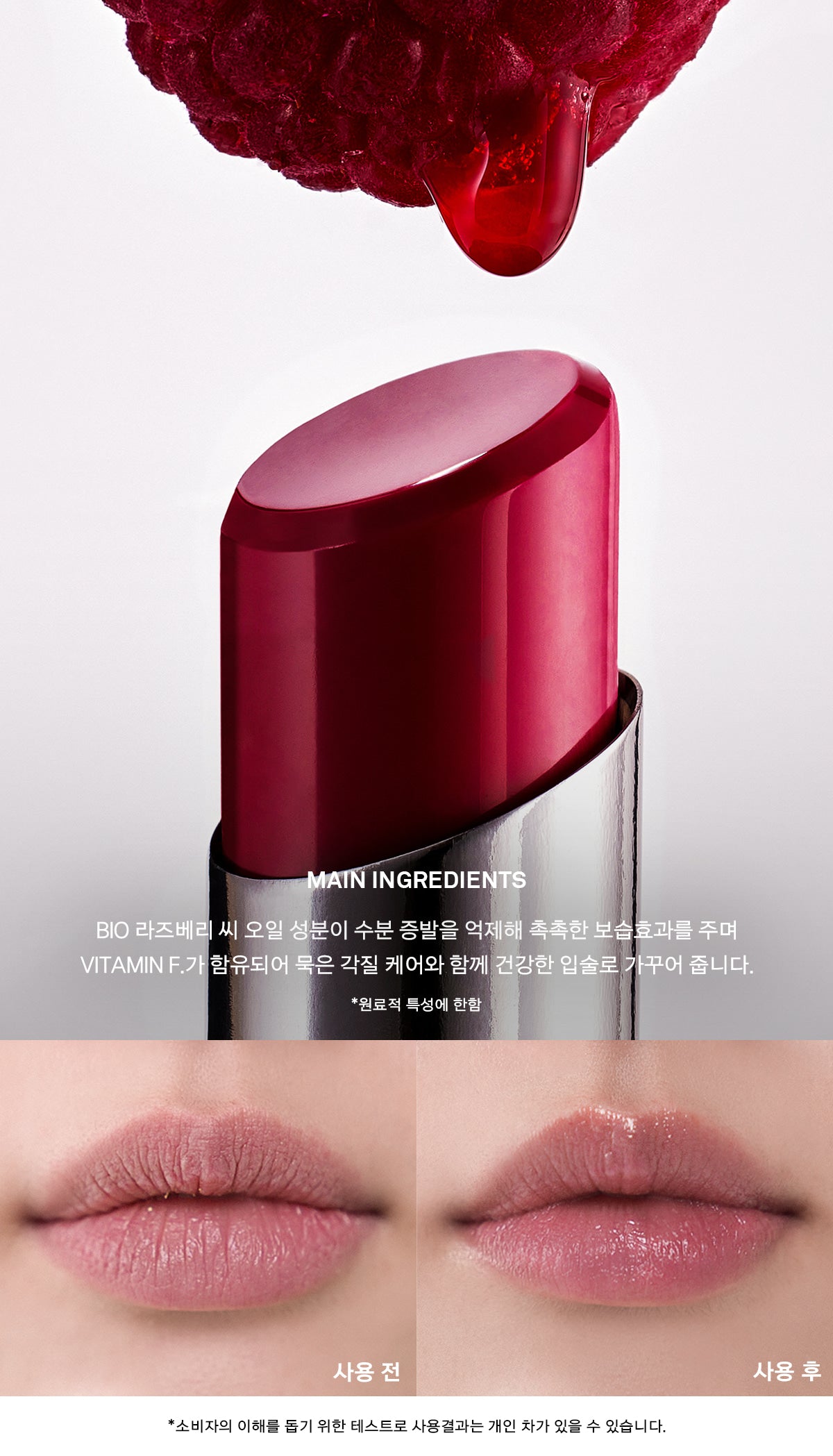 BIO raspberry seed oil prevents moisture evaporation and provides a moisturizing effect, and VITAMIN F. is included to care for dead skin cells and create healthy lips.