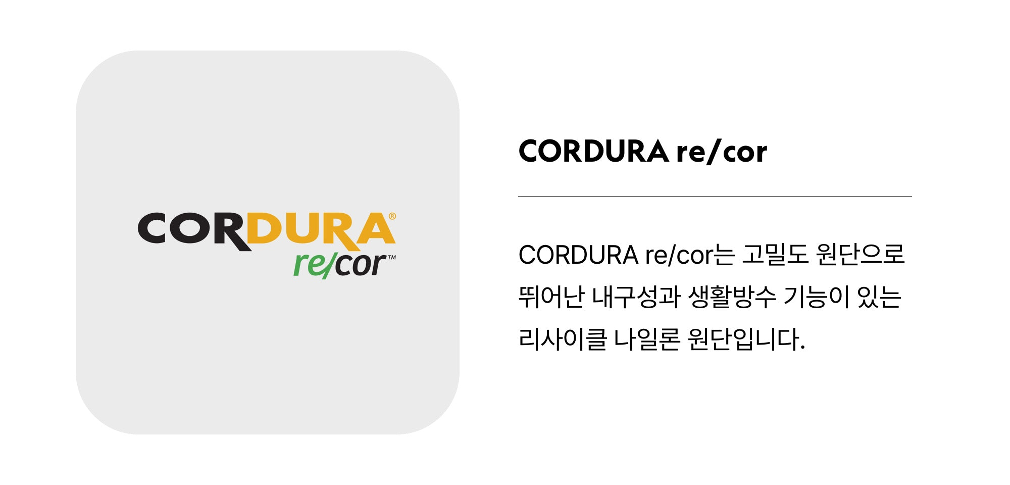 - CORDURA re/cor: Made from recycled nylon with high-density weave, this fabric is exceptionally durable, water-resistant, and built to last.