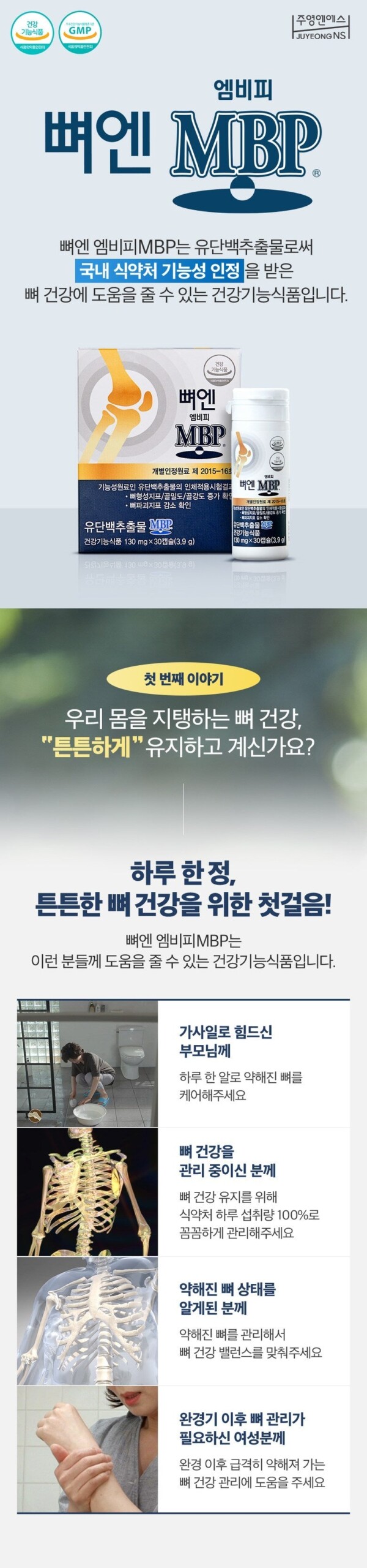 Jooyoung NS BoneN MBP is a health functional food designed to support bone health. Recognized by the Ministry of Food and Drug Safety, this product primarily consists of a milk protein extract known as MBP (Milk Basic Protein). MBP plays a crucial role in maintaining and improving bone health.