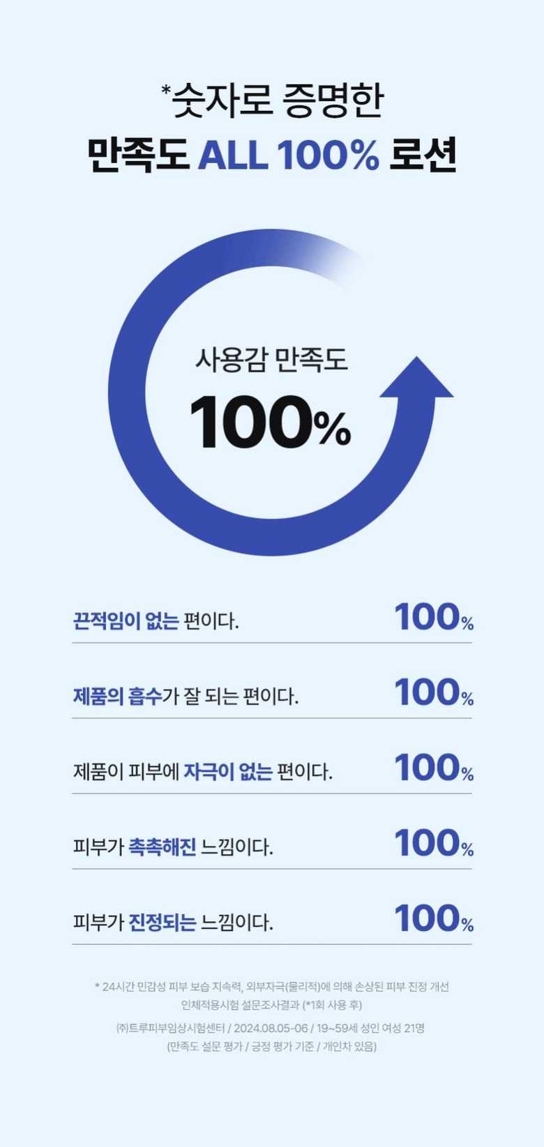 *Based on a human application test survey conducted by True Skin Clinical Research Center from 2024.08.05-08 on 21 adult women aged 19-59 (after 1 use). Results reflect positive evaluation criteria for satisfaction; individual results may vary. Study measured 24-hour sensitive skin hydration persistence and improvement in skin soothing due to external irritation (collagen).