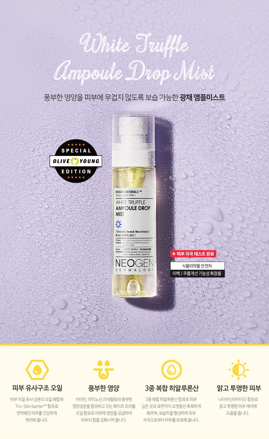 The Neogen Dermalogy White Truffle Ampoule Drop Mist is a highly moisturising and energising mist-type ampoule containing precious white truffle to nourish and moisturise your skin whenever and wherever you are! This unique mist-type ampoule has an oil drop texture that combines the hydrating effects of oil and moisturising effects of an ampoule to instantly hydrate the skin, while protecting the skin from environmental damage for a hydrated, radiant glow.