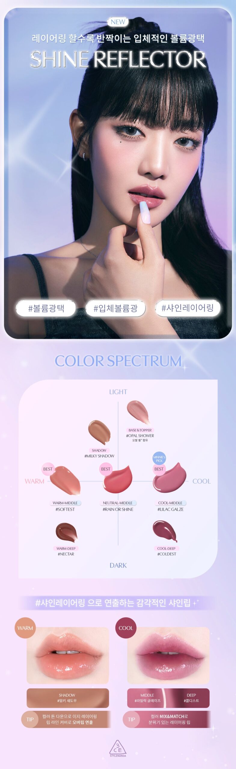 Enhanced 3D Glow & Volume: The 3CE Shine Reflector stands out with its ability to offer a three-dimensional glowing volume, creating a high-gloss effect on the lips. This unique formula ensures a 360-degree voluminous shine, reflecting light from every angle for an exceptionally radiant appearance.