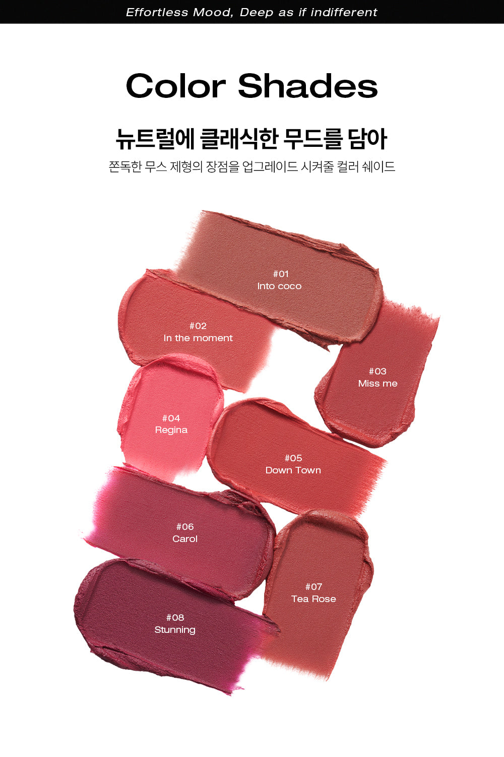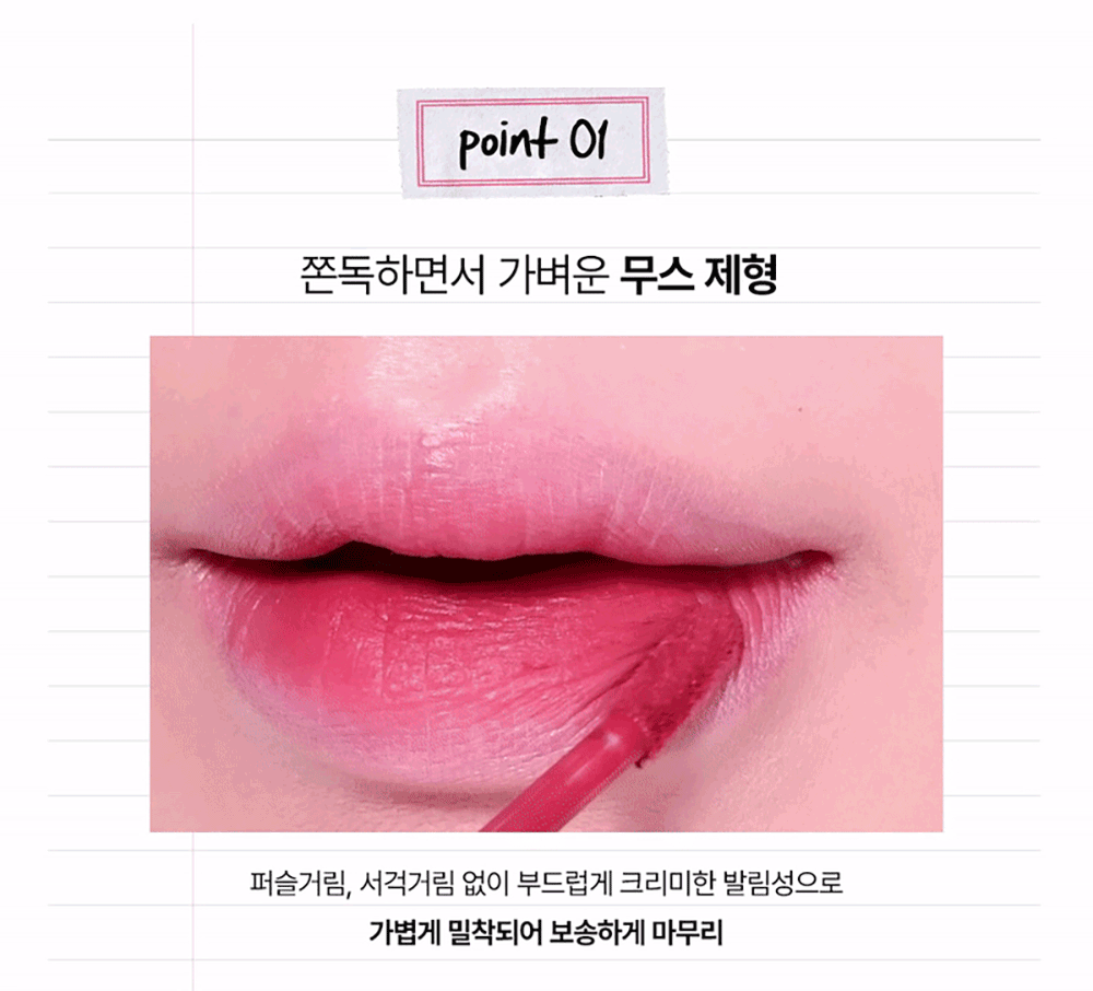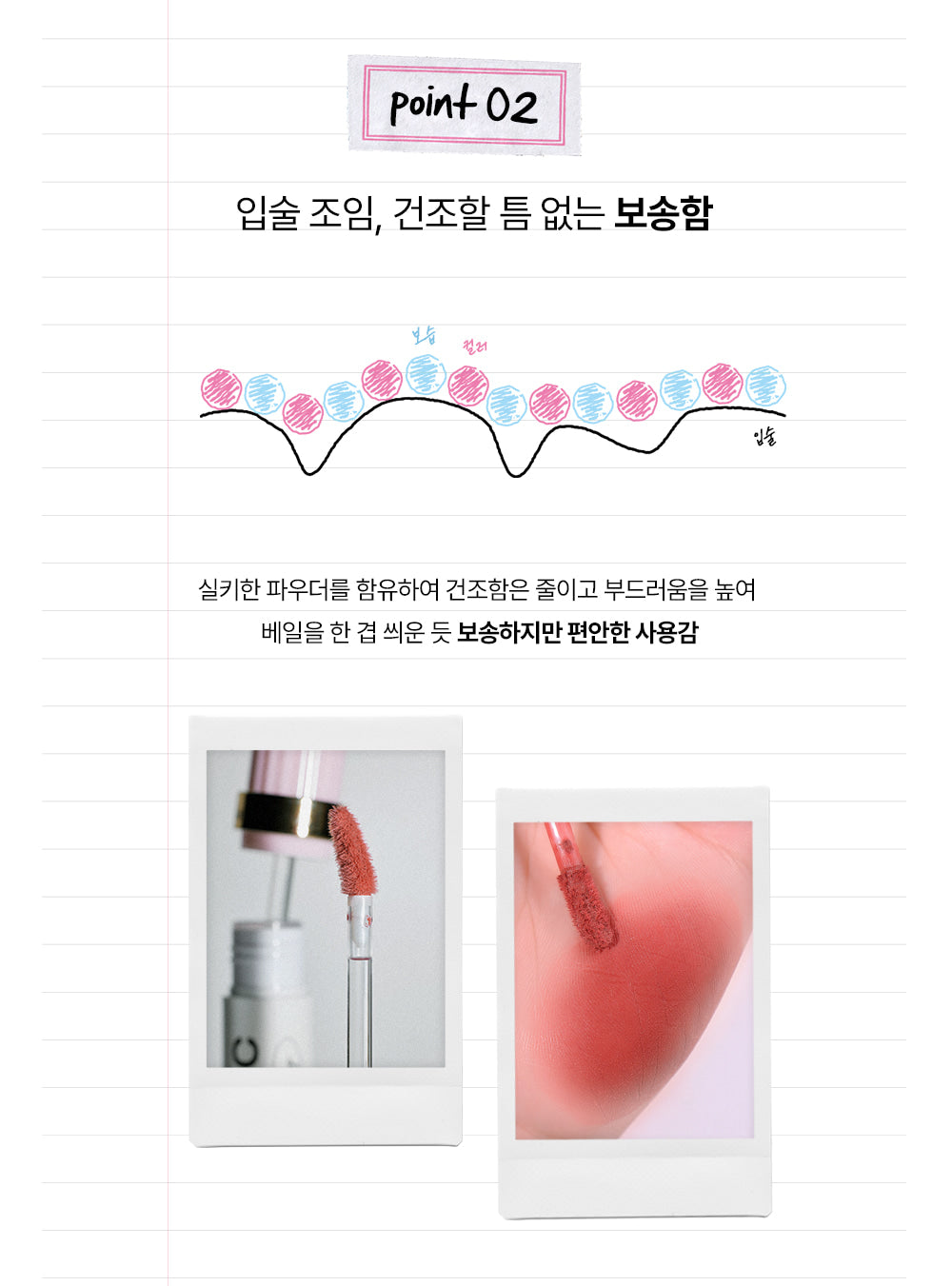 Say goodbye to dryness! This tint contains silky powder that reduces dryness while increasing softness. It creates a comfortable, soft feeling on your lips, as if a delicate veil has been draped over them.