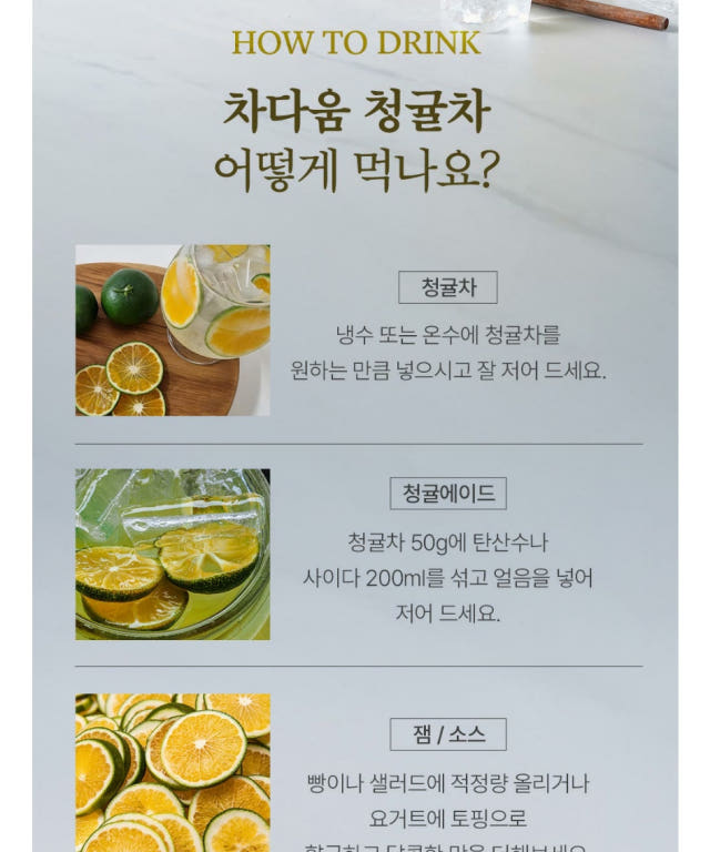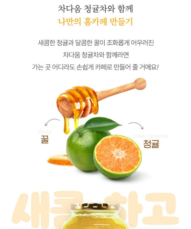A refreshing Korean tea made with Jeju Island green tangerines (cheong-gyul) and Korean honey. Green tangerines are harvested in August-September and have a distinctively tart, citrusy flavor that is both refreshing and invigorating.