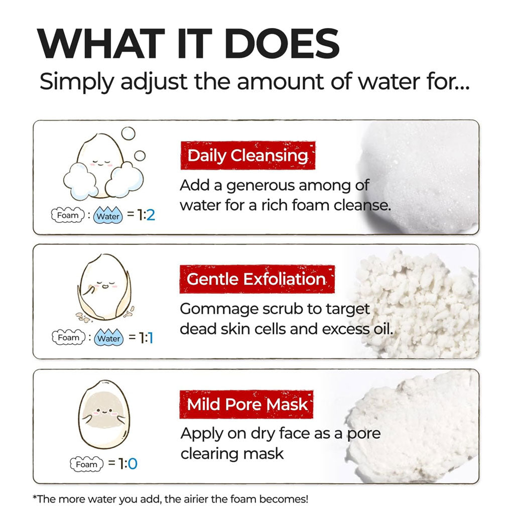 The NUMBUZIN No.3 Rice Enzyme Skin Softening Cleansing Foam is a multi-use facial cleanser that can be used as a mild pore pack, exfoliator or daily cleanser for radiant and smooth skin. Packed with five types of Fermented Rice Extracts rich in enzymes like Protease, Lipase and Cellulose to gently lift dirt, excess sebum and dead skin cells from pores while nourishing skin. This 3-step transforming cleansing foam starts off with a creamy texture to a soft gommage and then to an airy, bubble foam cleanser, so you can personalise your skincare needs depending on the amount of water you add to the formula!