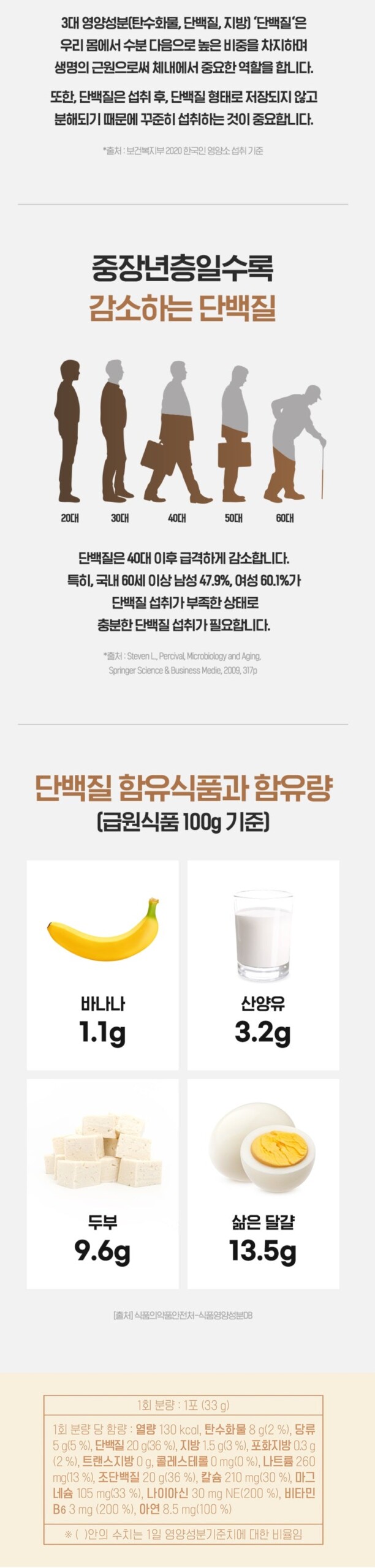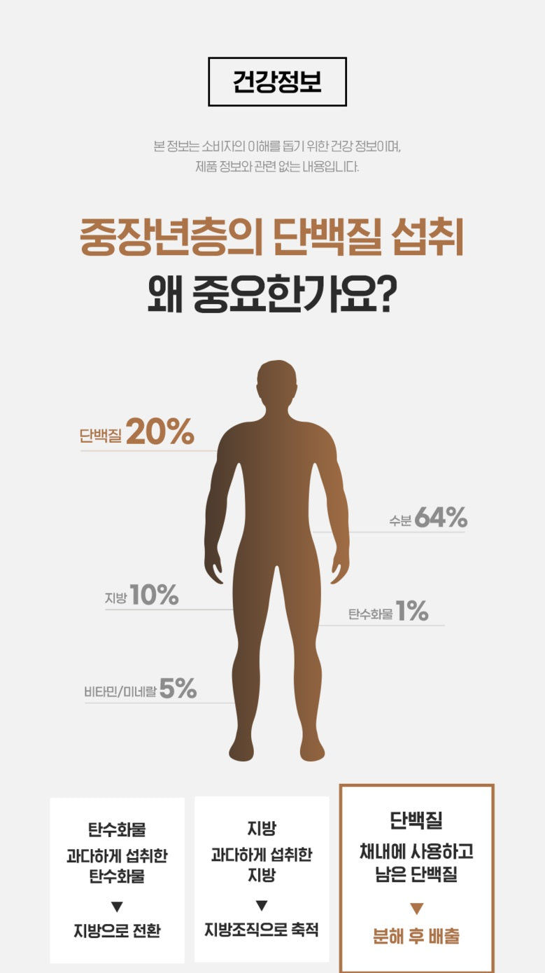 Protein declines sharply after the age of 40. In particular, 47.9% of males and 60.1% of females over 60 years of age in Korea lack protein intake, so sufficient protein intake is required.