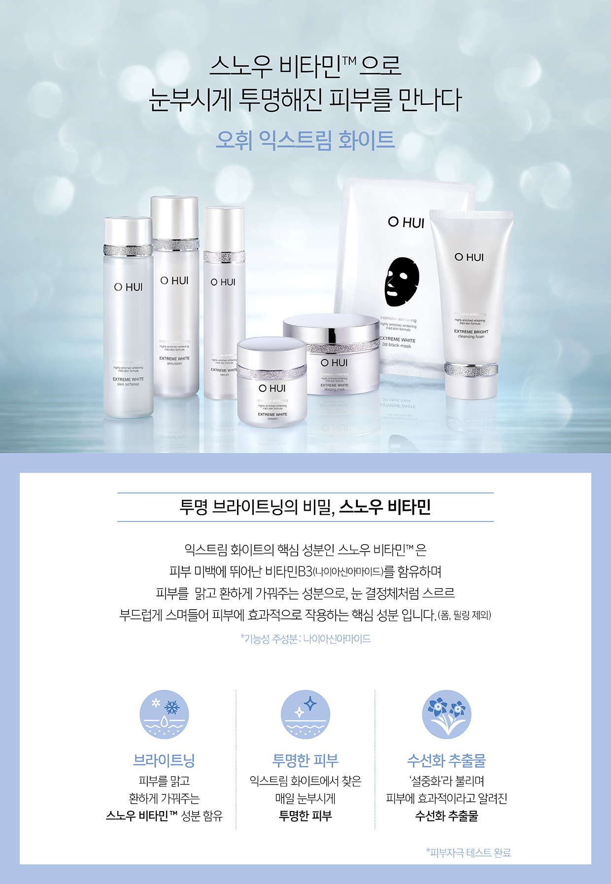 Snow vitamin, a key ingredient of Extreme White, contains vitamin B3 (niacinamide), which is excellent for skin whitening, and makes the skin clear and bright.