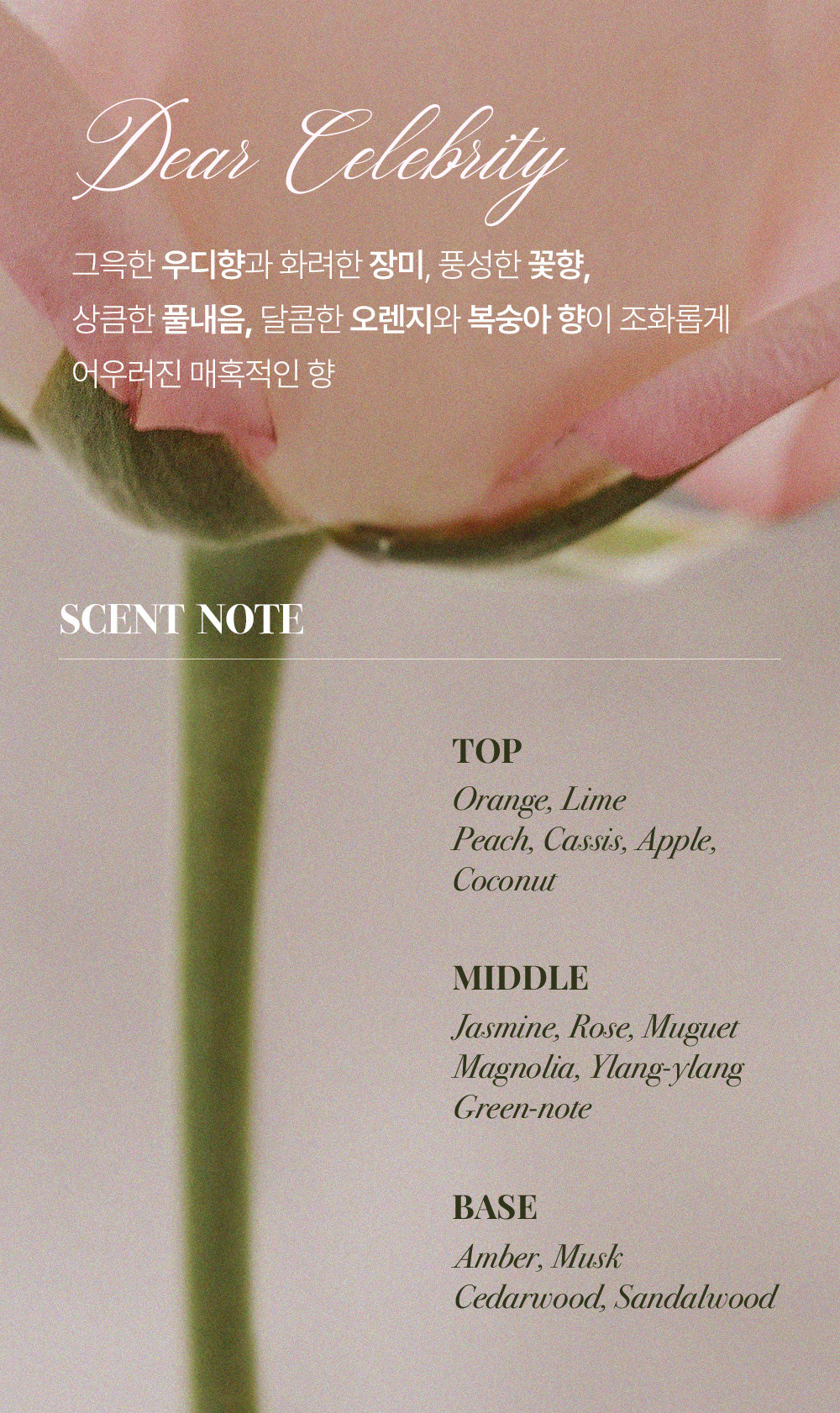 A signature scent that blends sophistication and nature. The fresh floral musk base is gentle yet distinctive, combining woody notes, lavish rose, and zesty citrus to create a scent that lingers beautifully.