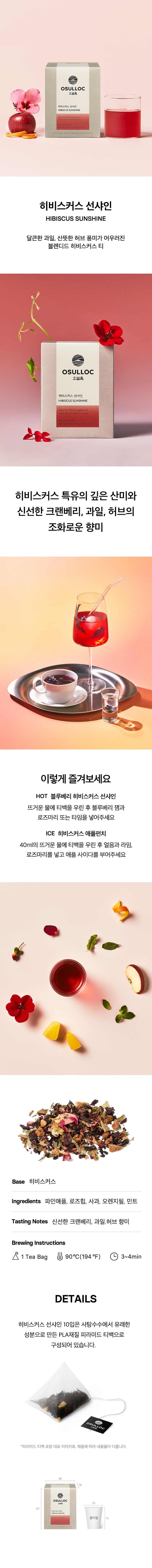 More than just a beverage, OSULLOC Hibiscus Sunshine Tea is an invitation to pure delight. Our unique blend features premium hibiscus petals (41.5%), carefully intertwined with vibrant, sweet fruits like crisp apple and zesty orange peel. Complementing this fruity symphony are refreshing mint and antioxidant-rich rosehip, adding depth and natural goodness to every sip.