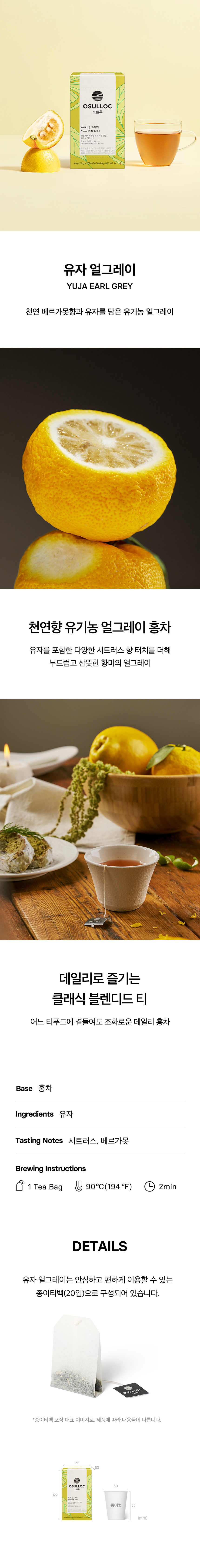 - Place one OSULLOC Yuja Earl Grey tea bag into your favorite mug.