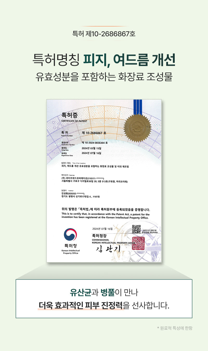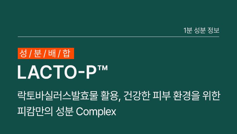 - LACTO-P™ Complex: Powered by Lactobacillus fermentation, this patented formula (Patent 10-2686867) is designed to improve sebum and acne. It features a blend of lactic acid bacteria and purslane to effectively soothe and maintain a healthy skin environment.