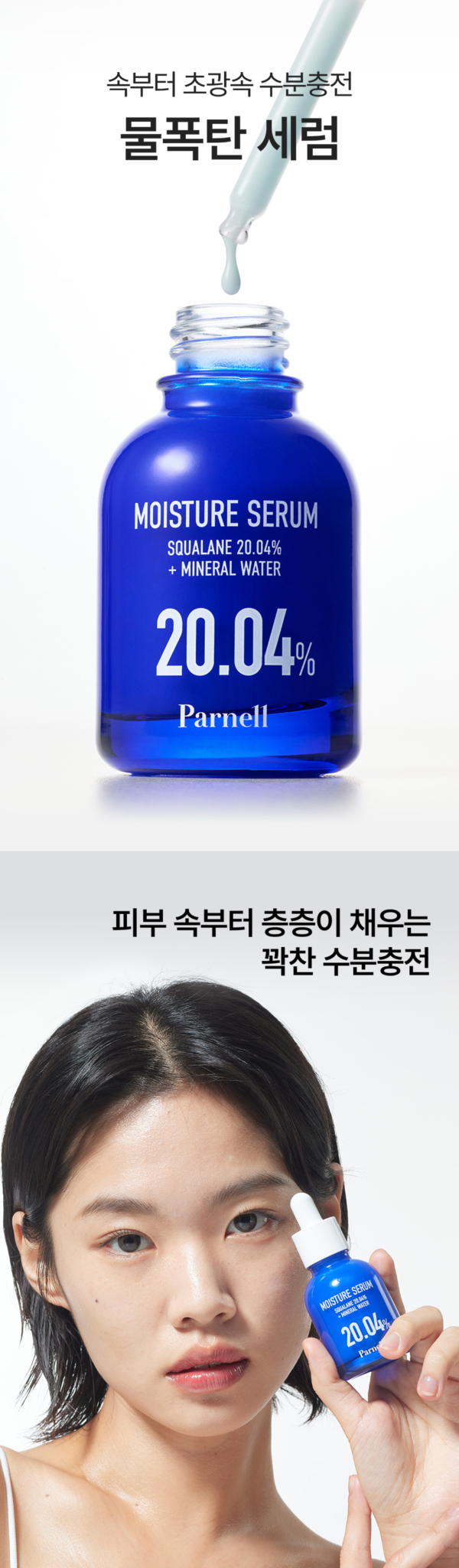 PARNELL Squalane 20.04% Mineral Water Moisture Serum features an even higher concentration of squalane than the cream version for intensive hydration treatment. This blue dropper serum delivers deep moisture with a lightweight, fast-absorbing formula.
