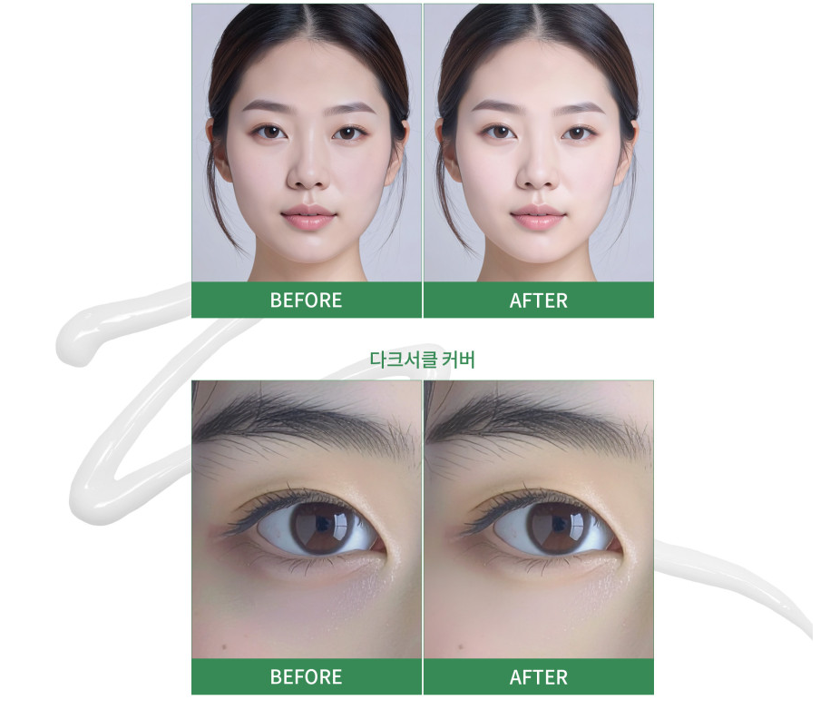 (Image analysis integrated: The product provides a natural tone-up effect and helps cover dark circles, as shown in the before & after images.)