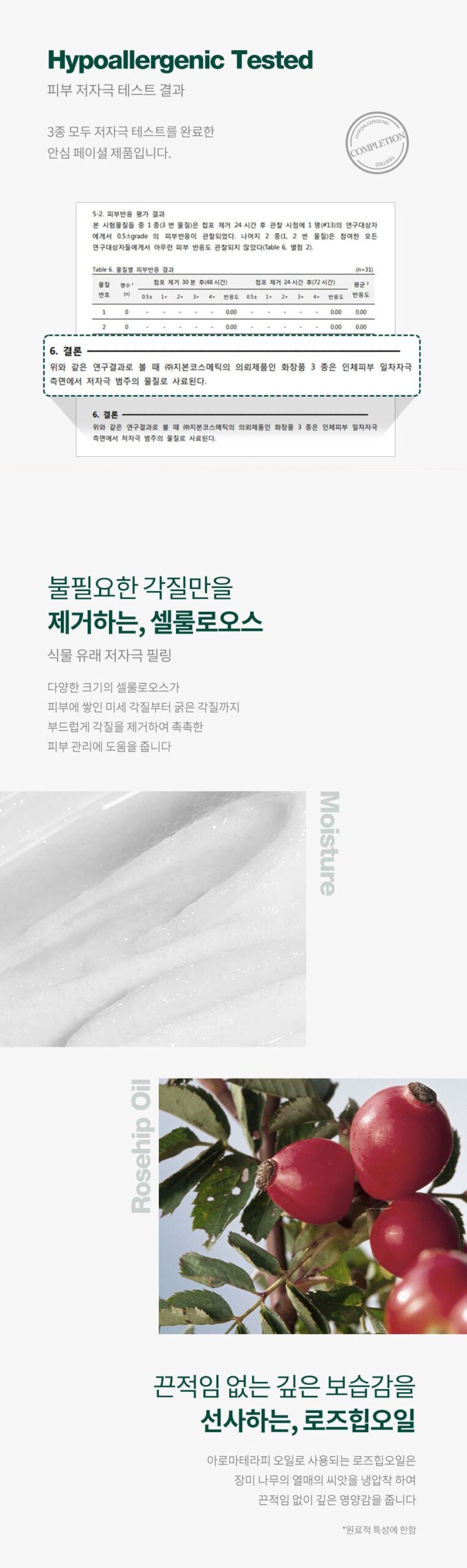 A hypoallergenic facial peeling gel that contains cellulose and rosehip oil to gently remove dead skin cells and manages dry and rough skin texture moistly and transparently.
