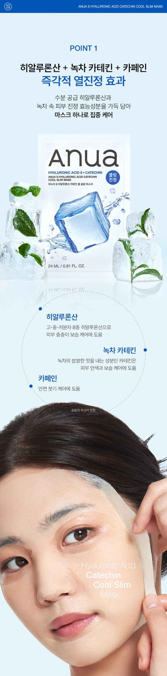 Infused with Hyaluronic Acid, Green Tea Catechin, and Caffeine, this mask delivers instant cooling care and moisture to overheated or fatigued skin.