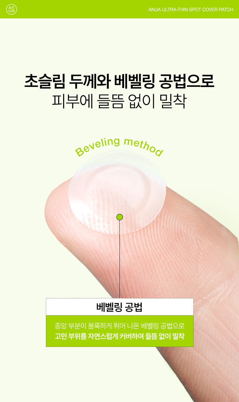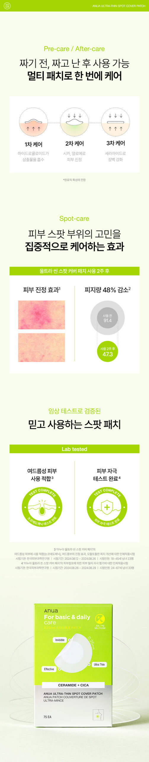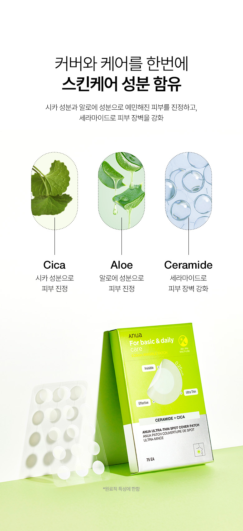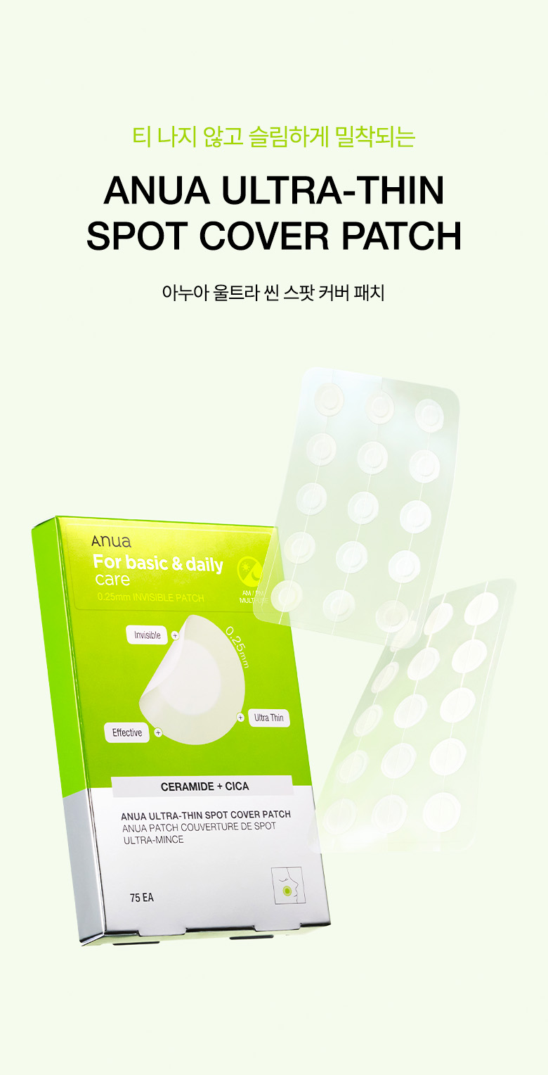 The Anua Ultra Thin Spot Cover Patches are designed for discreet and effective blemish care. With a super-slim thickness of just 0.25mm and a beveled edge design, these patches seamlessly adhere to your skin without lifting—providing a natural look even under makeup.