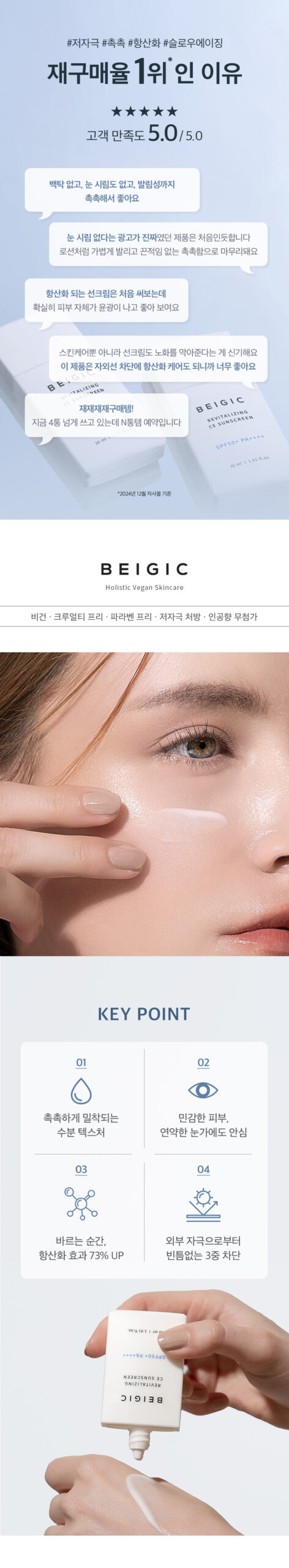 At first, I approached the BEIGIC Revitalizing CE Sunscreen with a dash of skepticism. The sunscreen claims to pack antioxidant power while ensuring featherlight wear — a promise I’m usually reluctant to trust given past disappointments in similar products. However, once applied, my initial doubts began to fade away; it felt almost like an invisible second skin! This stuff absorbs so effortlessly that you’d hardly believe it’s there. Furthermore, having notoriously sensitive eyes means I’m all too familiar with irritation during sunny outings— but this lovely formulation did nothing short of creating peace around my delicate eye area after hours outside in NYC’s fierce sunlit chase across the day’s city skyline! From hereon out? It’s safe on priority at home and trips abroad!