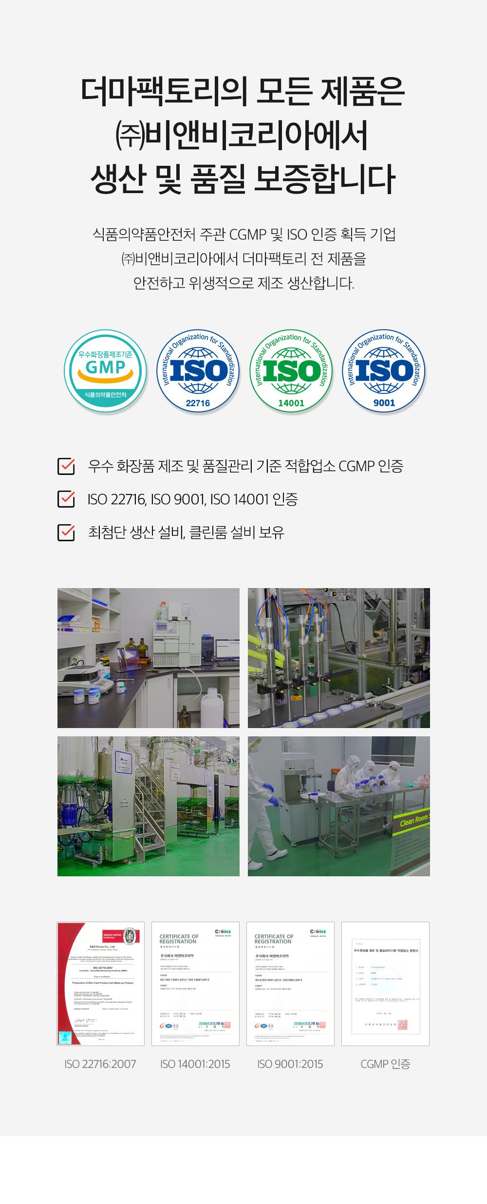 Produced in state-of-the-art cleanroom facilities, our gel cream is manufactured under CGMP and ISO certifications granted by the Korea Food and Drug Administration. This ensures a sanitary and safe production process for every batch.