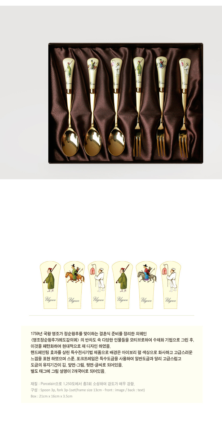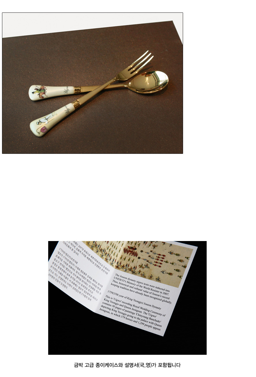 Step into the elegance of Joseon royalty with the Star Gift Uigwe Teaspoon & Fork Set, inspired by the grand 1759 royal wedding ceremony of King Yeongjo and Queen Jeongsun. This design beautifully revives the characters featured in the Uigwe—the official royal record—bringing their vivid charm into your everyday life.