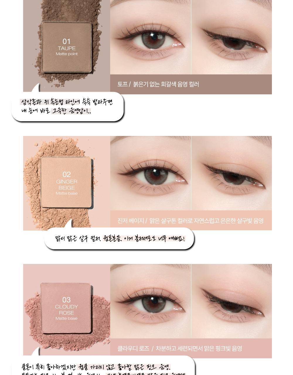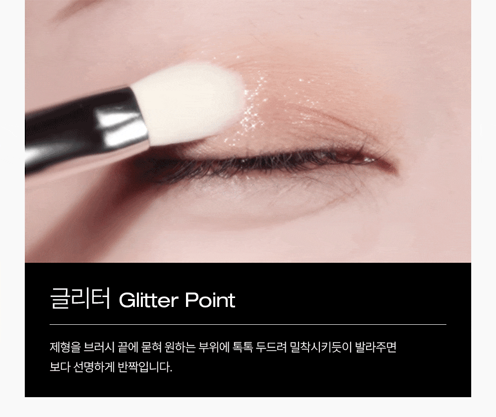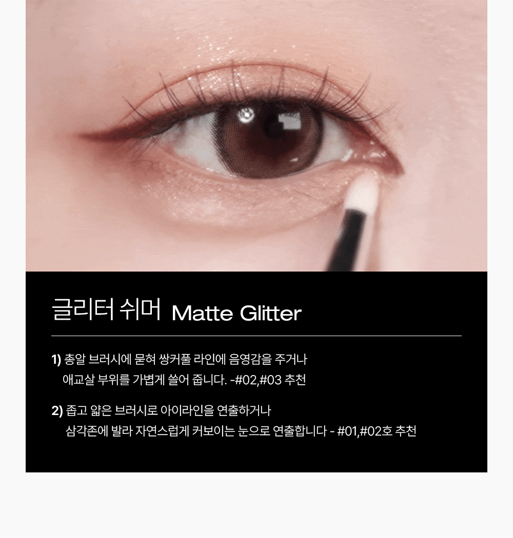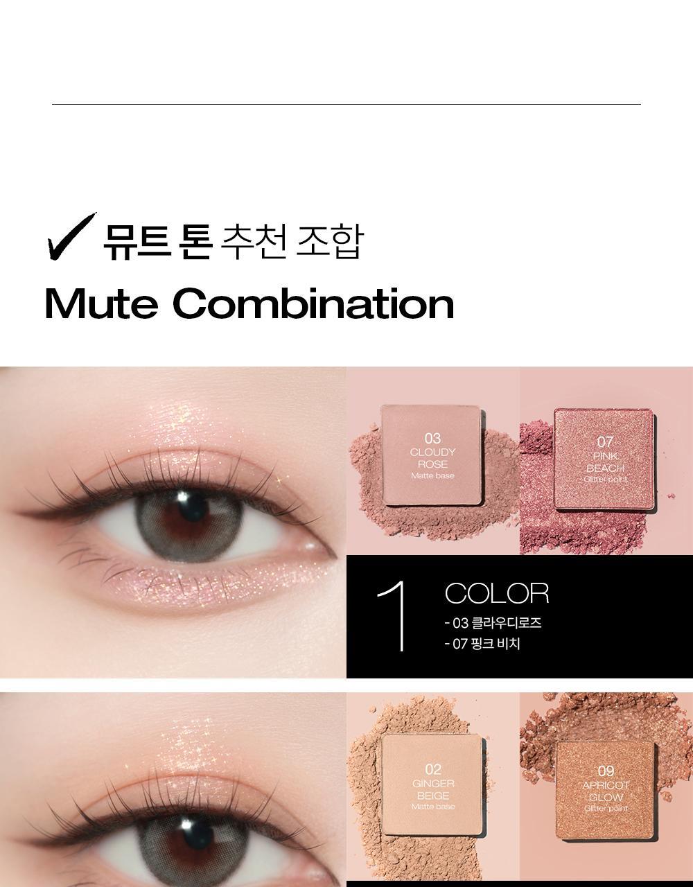 - Subtle Shading: Using a bullet brush, apply the matte glitter to the crease of your eyelid (double eyelid line) or lightly brush it along the lower lash line for a subtle shimmer that adds depth. Shades 02. GINGER BEIGE and 03. CLOUDY ROSE are ideal for this purpose, offering just the right amount of shimmer without overpowering.