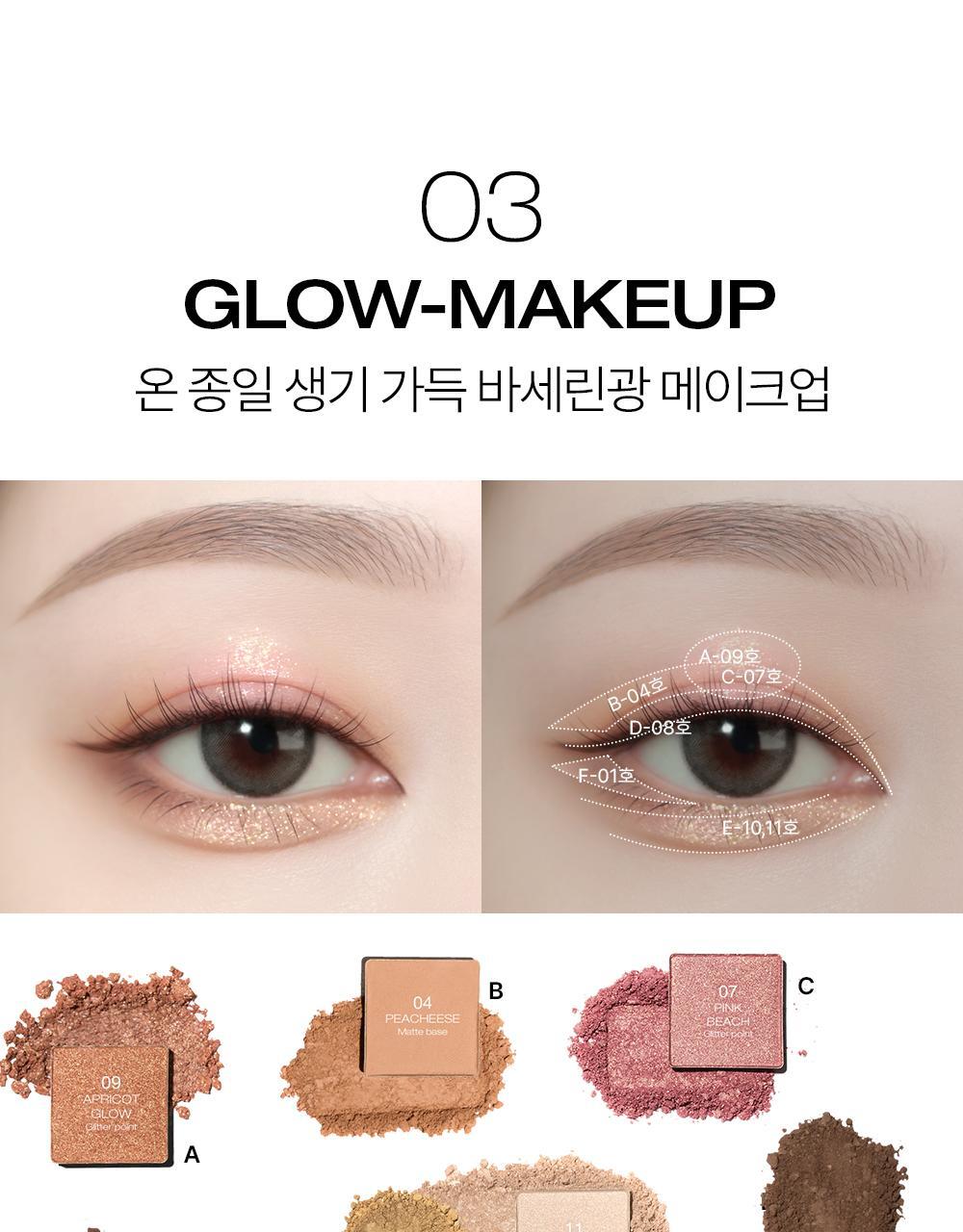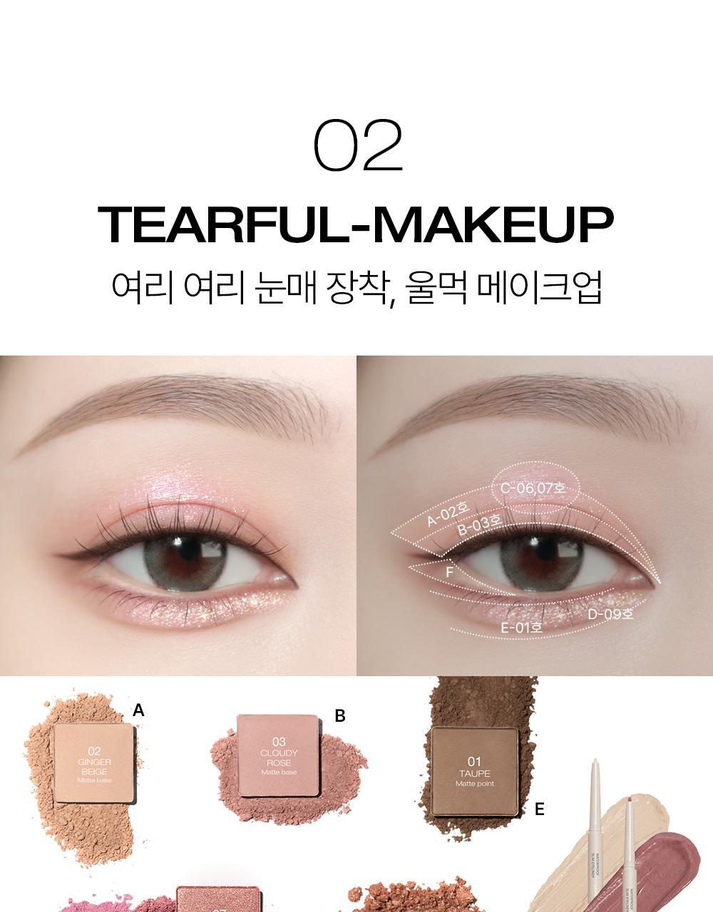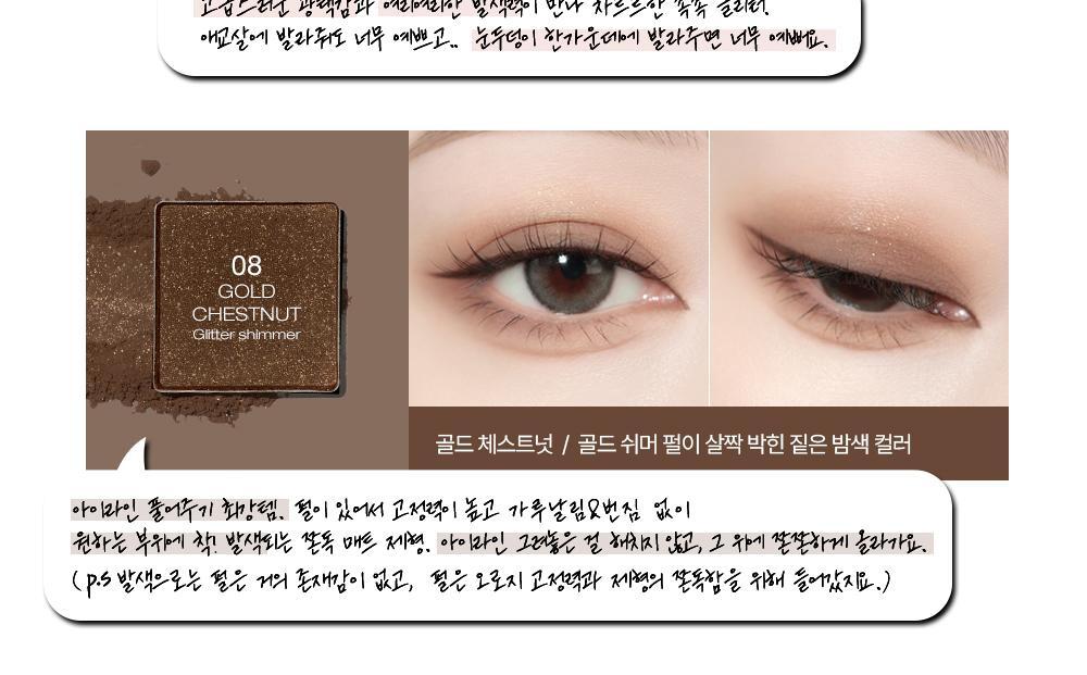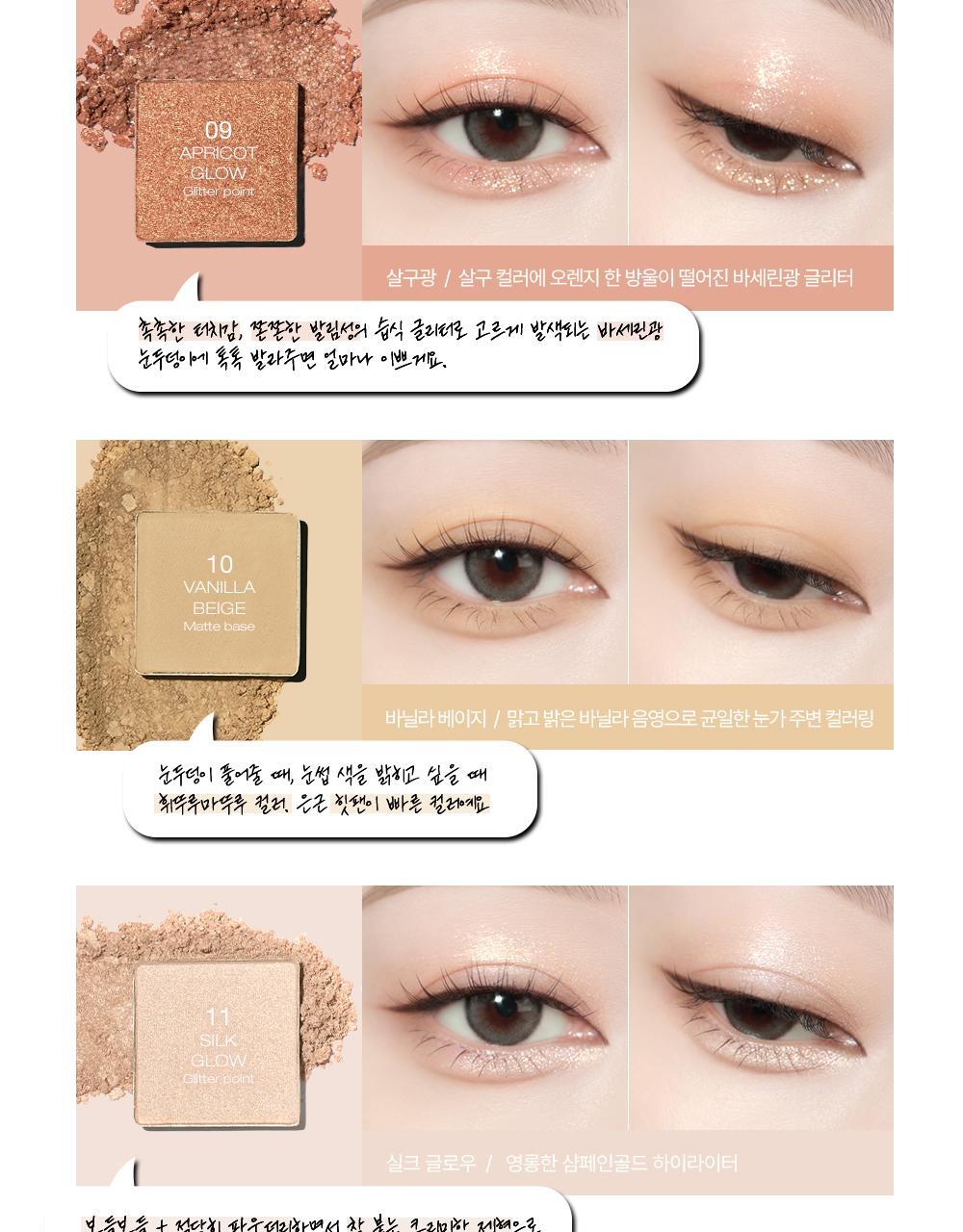 - Subtle Shading: Using a bullet brush, apply the matte glitter to the crease of your eyelid (double eyelid line) or lightly brush it along the lower lash line for a subtle shimmer that adds depth. Shades 02. GINGER BEIGE and 03. CLOUDY ROSE are ideal for this purpose, offering just the right amount of shimmer without overpowering.