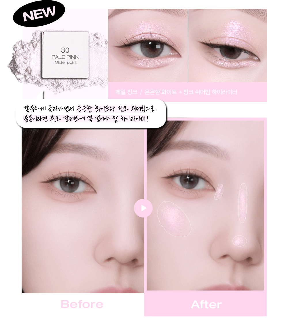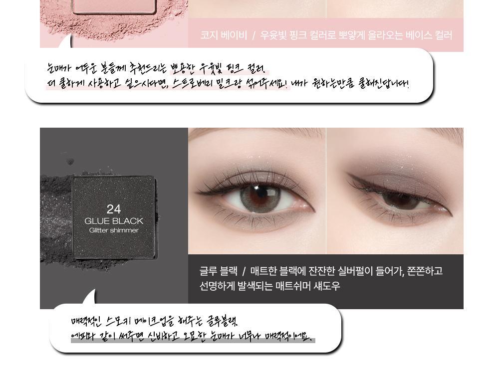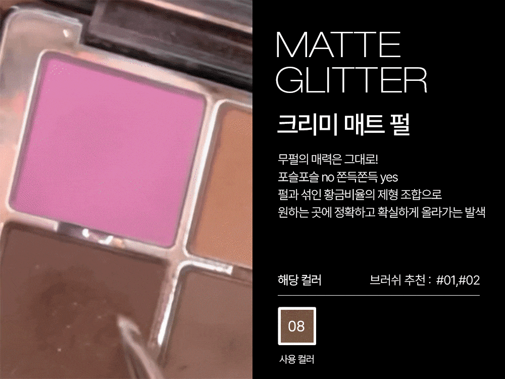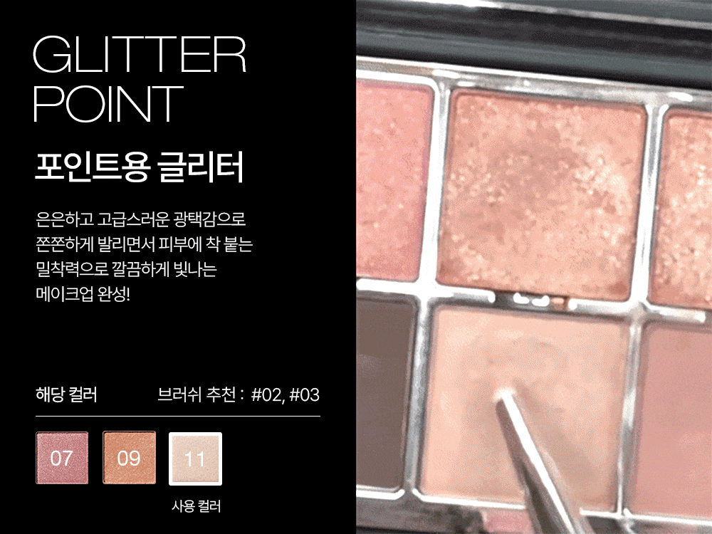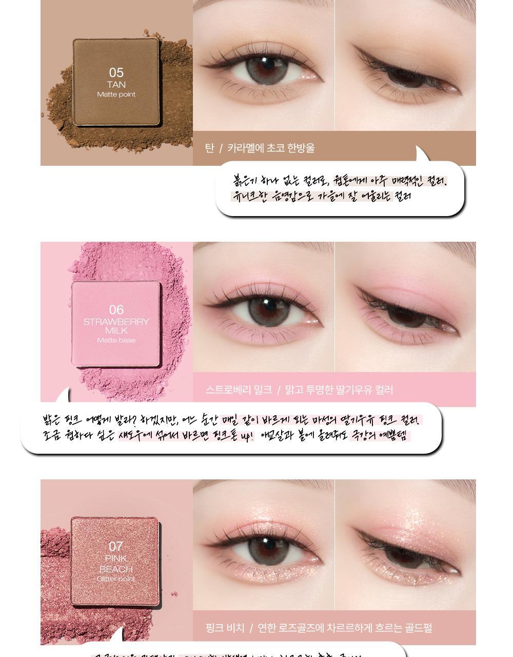 - Subtle Shading: Using a bullet brush, apply the matte glitter to the crease of your eyelid (double eyelid line) or lightly brush it along the lower lash line for a subtle shimmer that adds depth. Shades 02. GINGER BEIGE and 03. CLOUDY ROSE are ideal for this purpose, offering just the right amount of shimmer without overpowering.