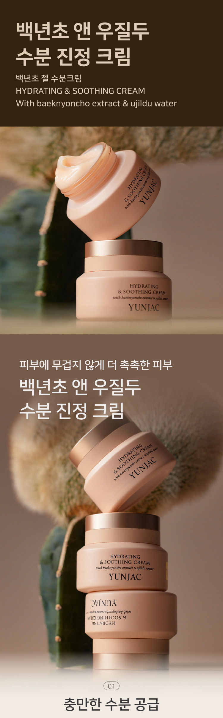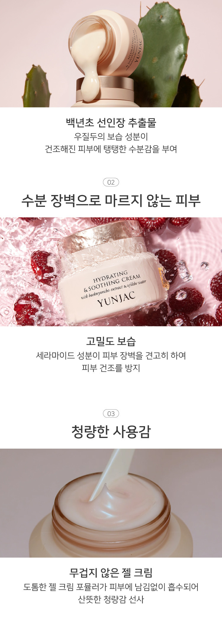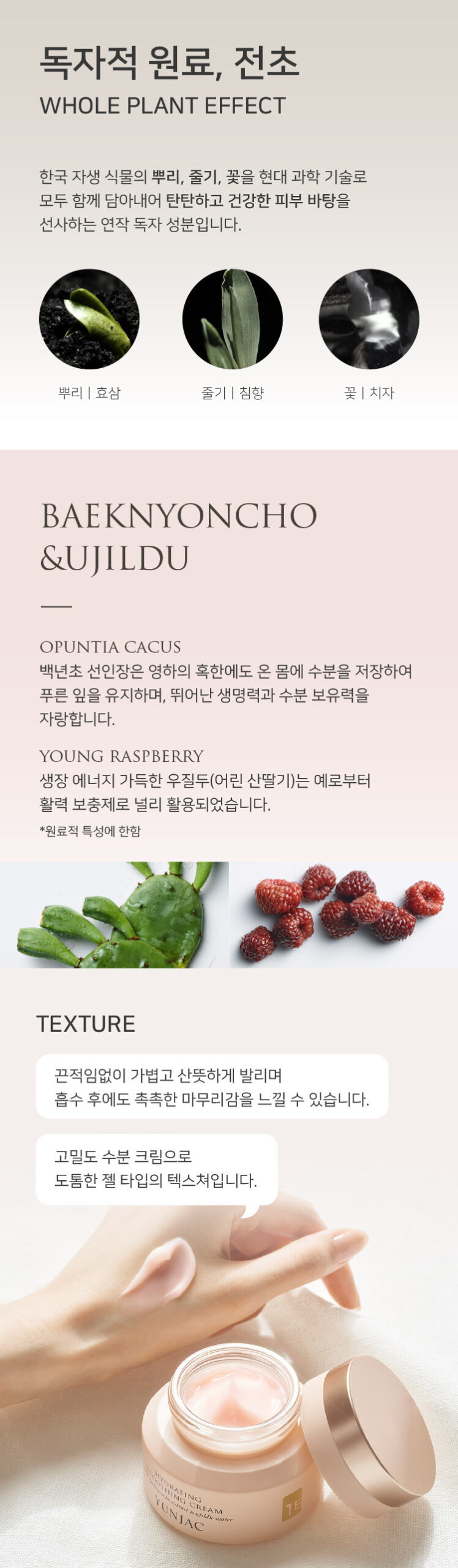Quench your skin’s thirst with the ultra-moisturizing power of YUNJAC’s Hydrating & Soothing Cream. This premium cream is enriched with Baeknyoncho (Opuntia Cactus) Extract and Ujildu (Young Raspberry) Water, two Korean botanical ingredients known for their exceptional hydration and revitalizing benefits.