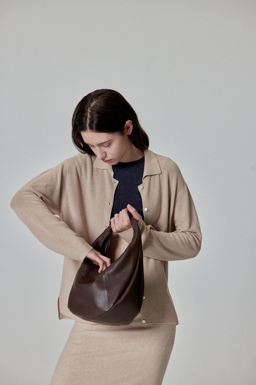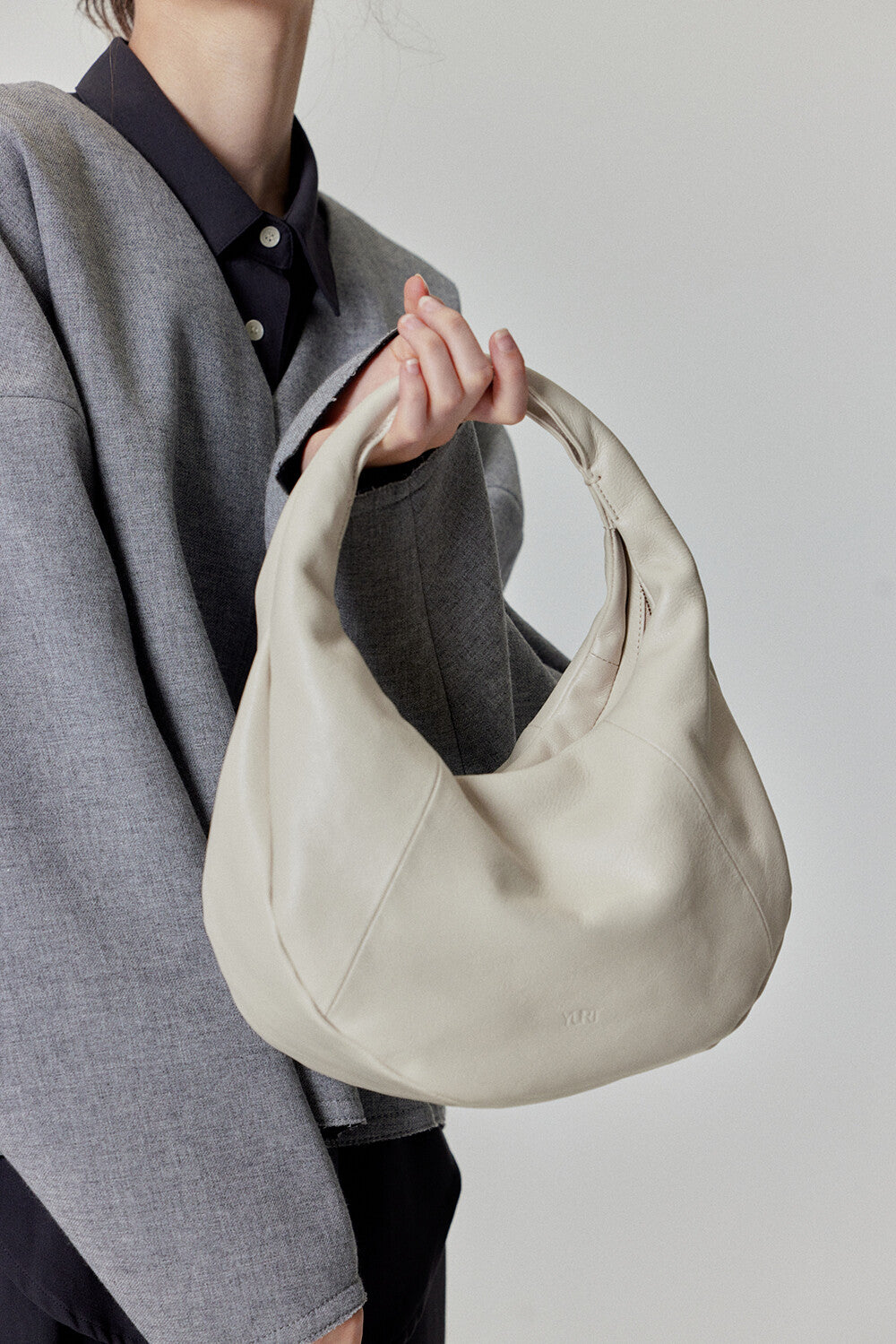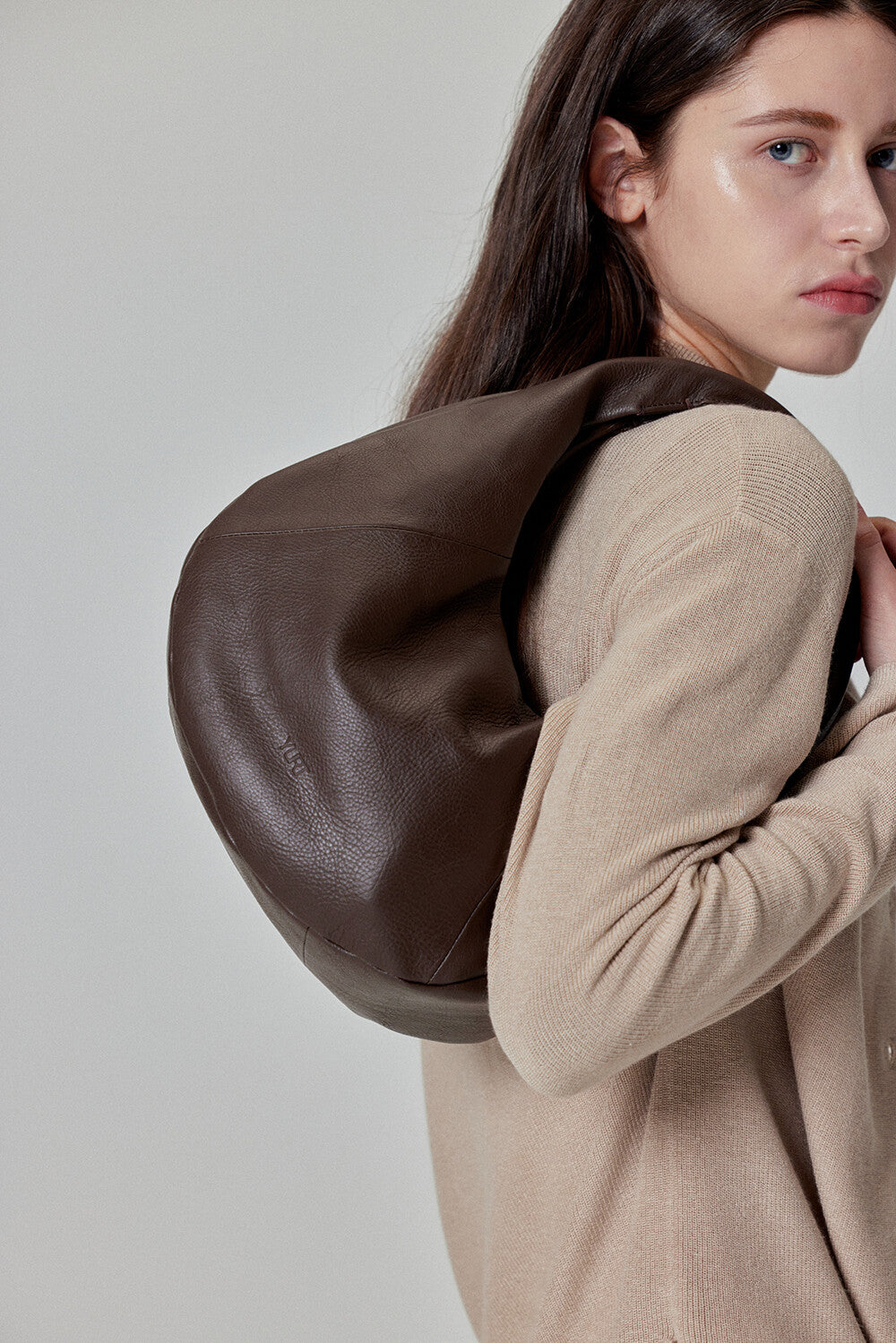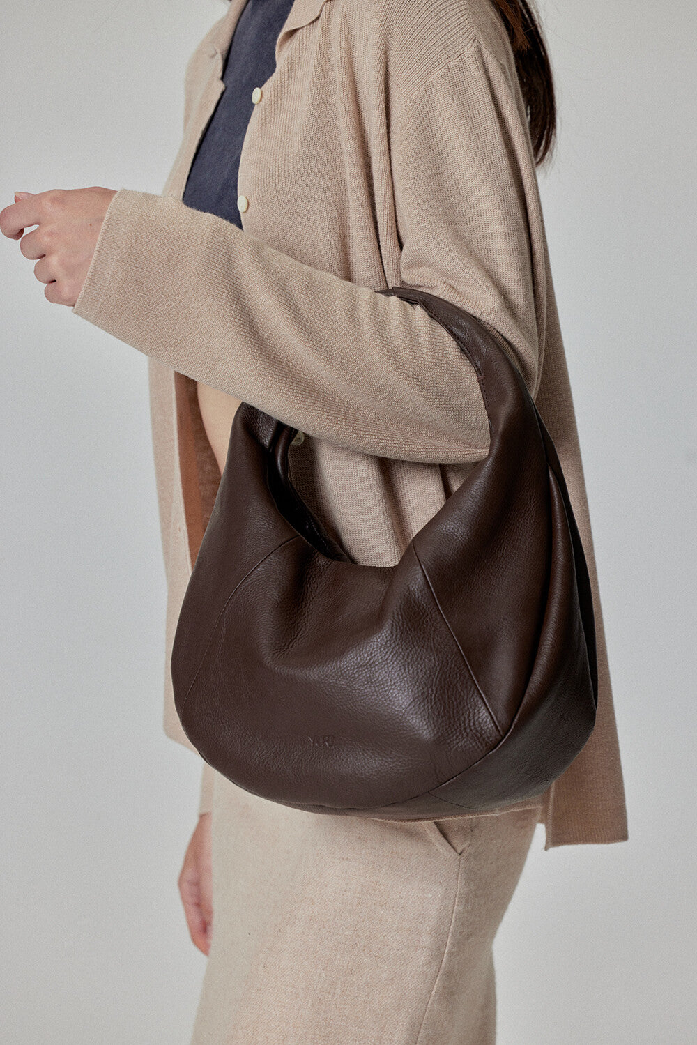 Elevate your style with this sleek and minimalist hobo bag. Crafted from high-quality cowhide, it features a bold, voluminous silhouette that adds a modern touch to any outfit. The soft yet firm leather structure ensures durability while maintaining a sophisticated look.