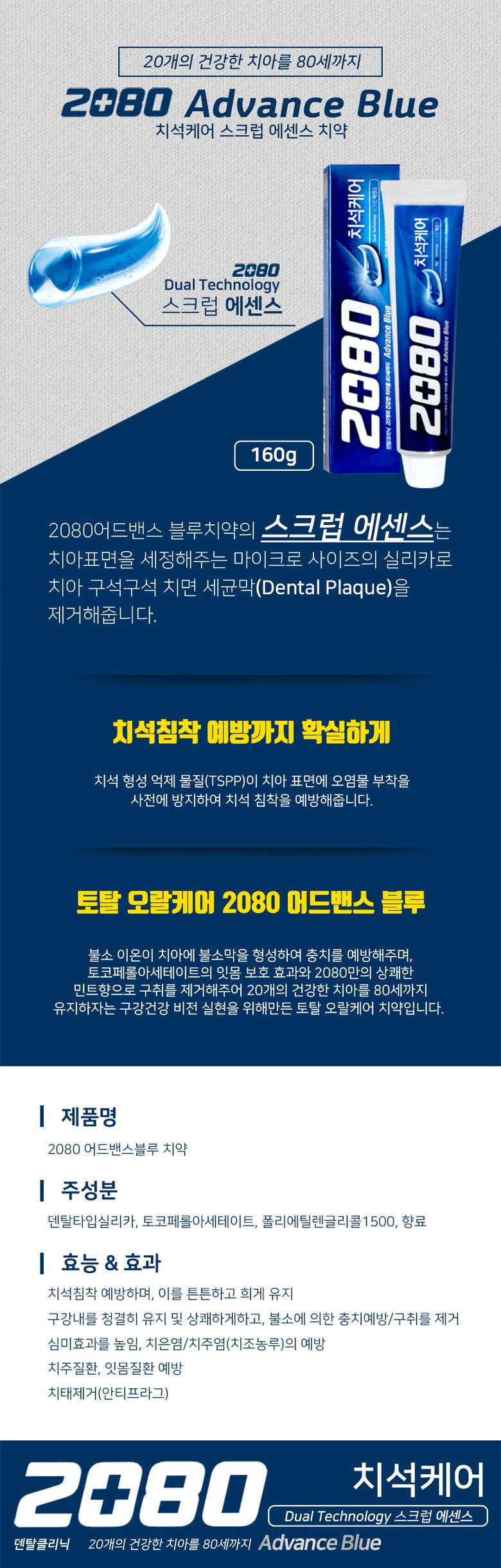 Tartar Care Scrub Essence Toothpaste* The scrub essence of the 2080 Advanced Blue toothpaste removes dental plaque from the tooth surface to every corner of the tooth with fine-sized silica.