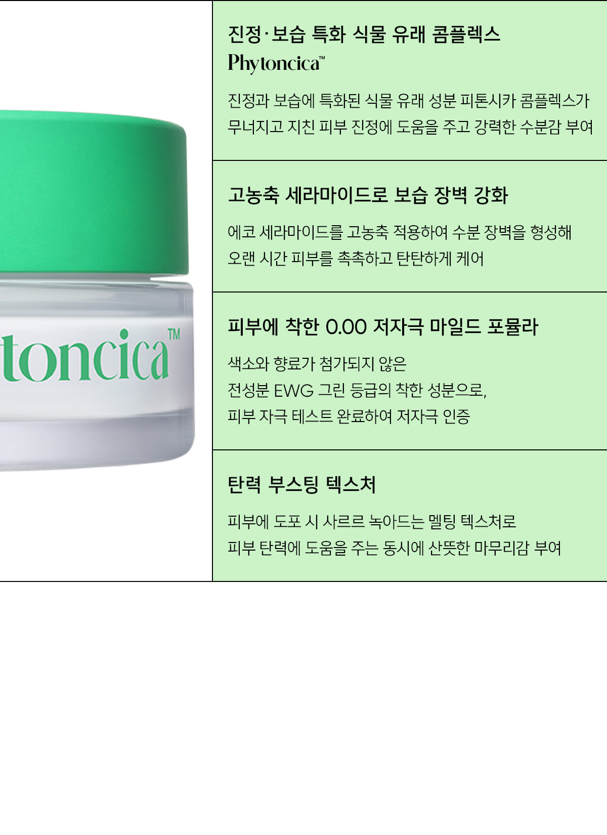 Plant-derived Phytoncica Complex provides calming and moisturizing effects. Panthenol and triple hyaluronic acid provide powerful moisturization, giving the skin a firm and hydrated feel. Mild formula with 0.00 irritation certified by EWG Green.