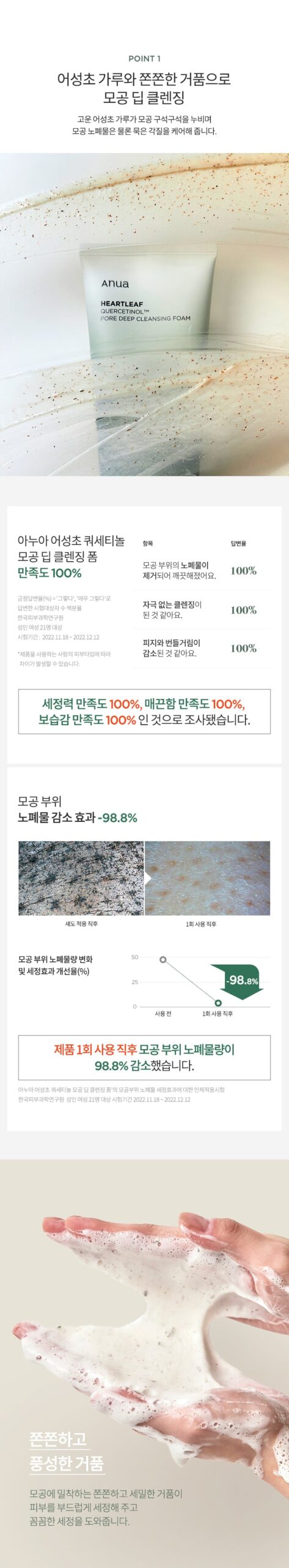 The Heartleaf Quercetinol Pore Deep Cleansing Foam is an Eoseongcho Deep Cleansing Foam specially formulated to clear away waste and dead skin cells from all corners of your pores. With a remarkable pore cleansing effectiveness of 98.8%, it has undergone skin irritation testing for your peace of mind.