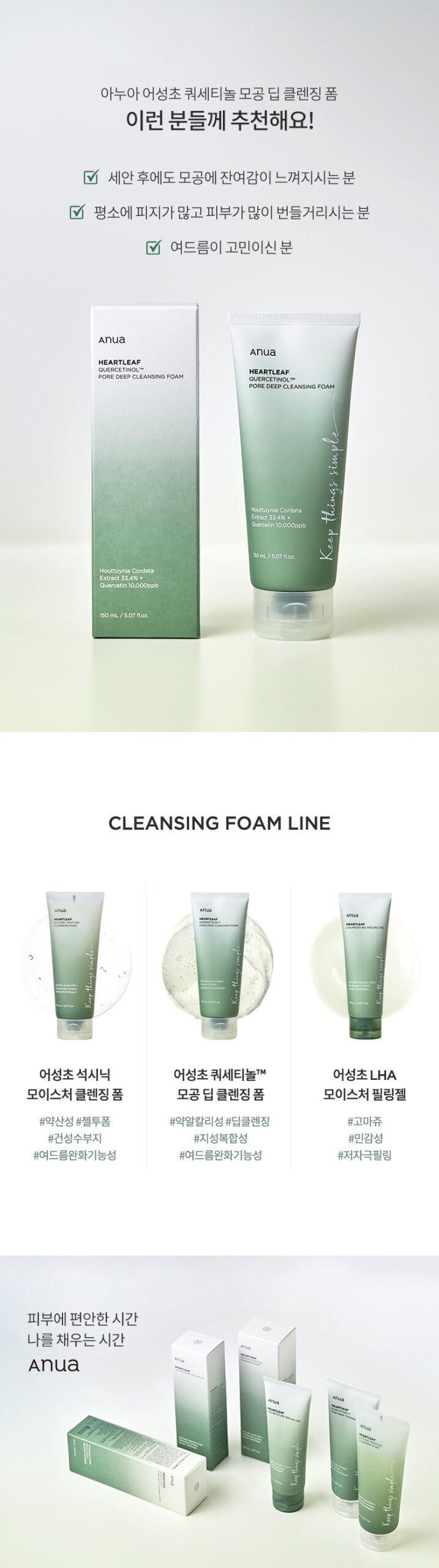 For Oily/Combination Skin: Consider the Anua Eoseongcho Quercetinol™ Deep Pore Cleansing Foam. Crafted for thorough sebum and pore cleansing, it deals with excessive sebum while effectively removing dead skin cells.