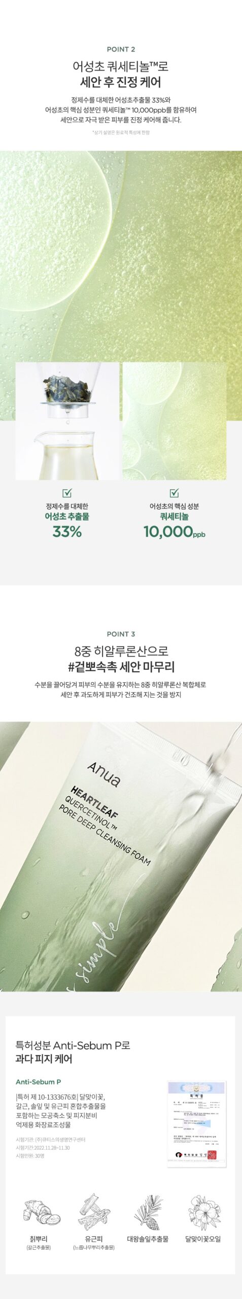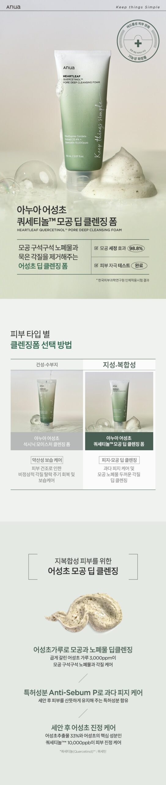 The Heartleaf Quercetinol Pore Deep Cleansing Foam is an Eoseongcho Deep Cleansing Foam specially formulated to clear away waste and dead skin cells from all corners of your pores. With a remarkable pore cleansing effectiveness of 98.8%, it has undergone skin irritation testing for your peace of mind.