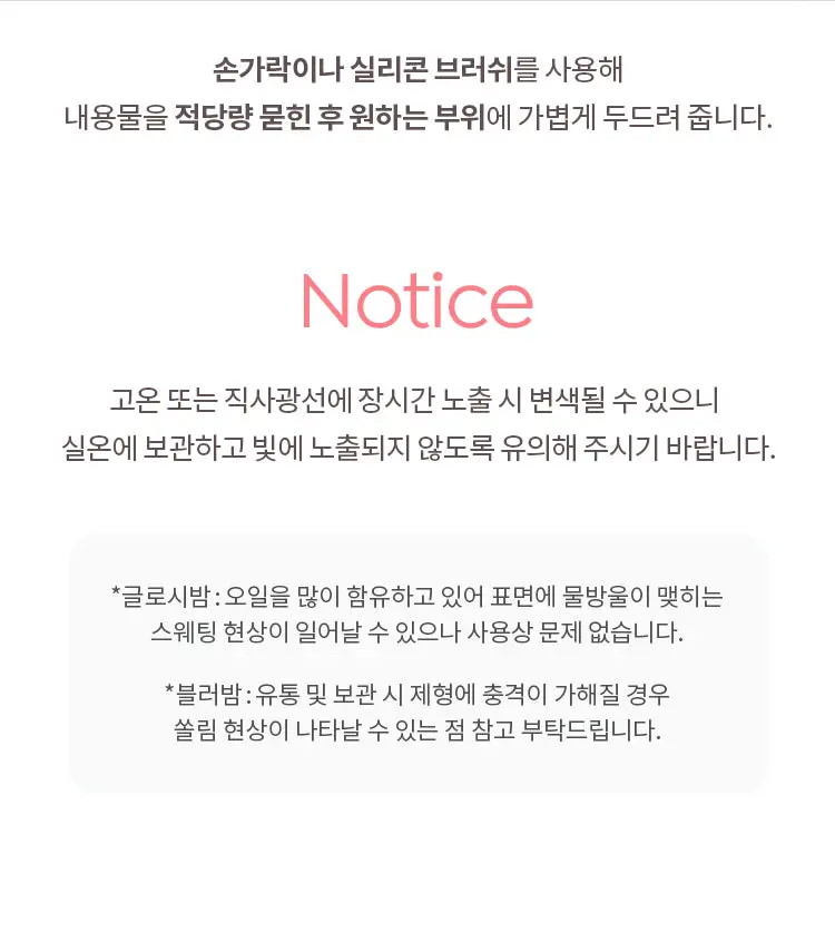 Sweating (small droplets on the surface) may occur in the glossy balm due to its high oil content – this is natural and does not affect performance.