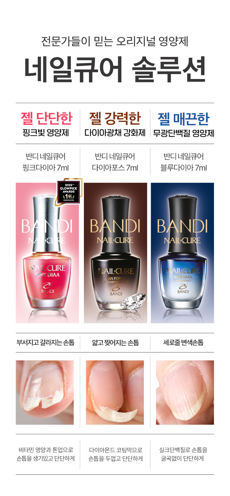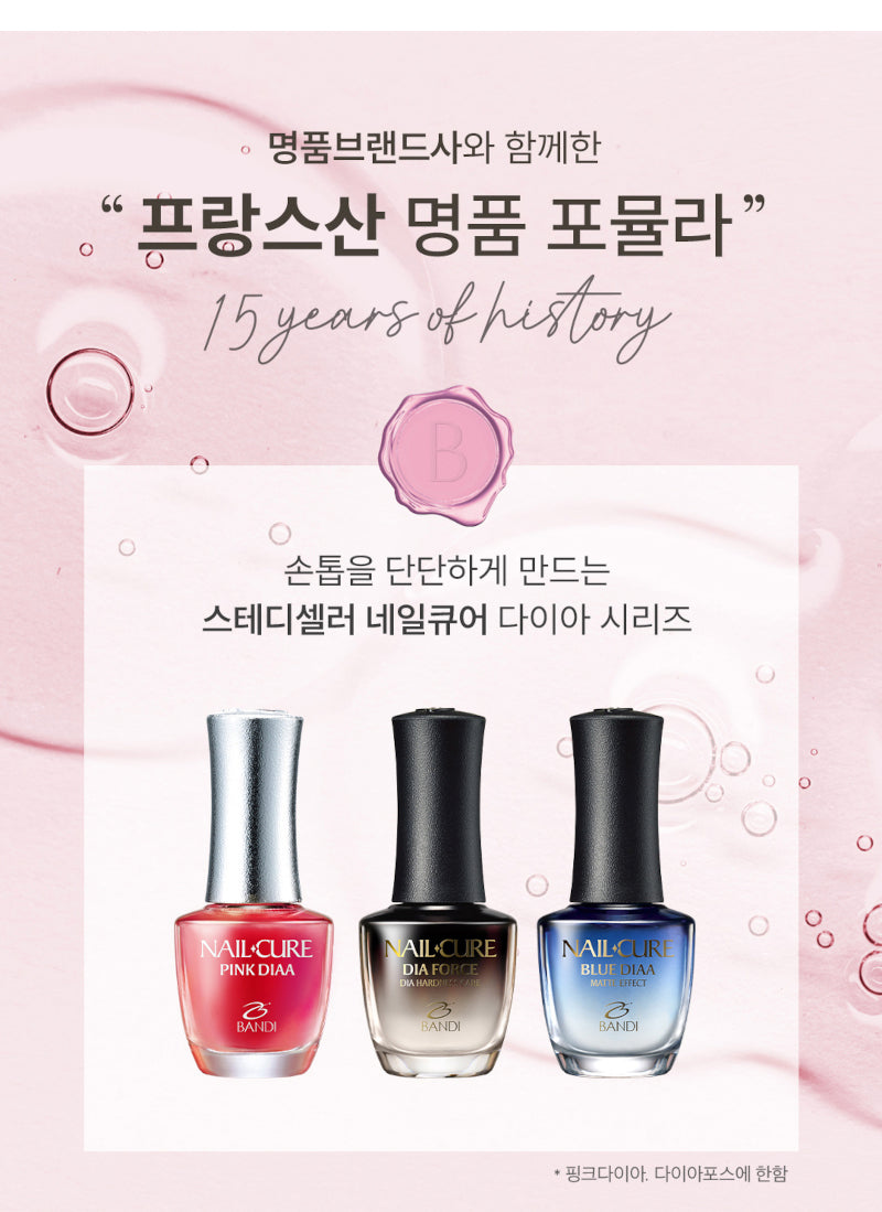 - Bandi Nail Cure Diaforce: Targeted for thin and tearing nails, this formula uses a diamond coating film to significantly increase nail thickness and hardness. It’s the ultimate solution for achieving hard nails, recommended by nail professionals for its super strengthening capabilities, enriched with genuine diamond ingredients.