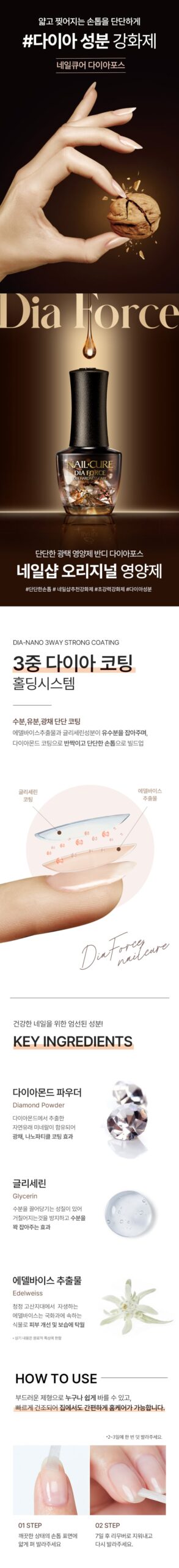 - Bandi Nail Cure Diaforce: Targeted for thin and tearing nails, this formula uses a diamond coating film to significantly increase nail thickness and hardness. It’s the ultimate solution for achieving hard nails, recommended by nail professionals for its super strengthening capabilities, enriched with genuine diamond ingredients.